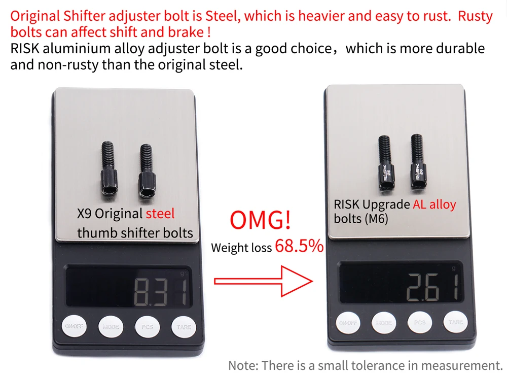 Оригинальный болт регулятора переключателя передач изготовлен из стали, которая тяжелее и легко ржавеет. Ржавые болты могут повлиять на переключение и тормоз!РЕГУЛИРОВОЧНЫЙ БОЛТ из алюминиевого сплава-хороший выбор, который прочнее и не ржавеет, чем оригинальная сталь.Оригинальные стальные болты переключения передач X9Риск обновления болты из сплава AL (M6)OMG!Потеря веса 68.5%Примечание: есть небольшая погрешность в измерениях.