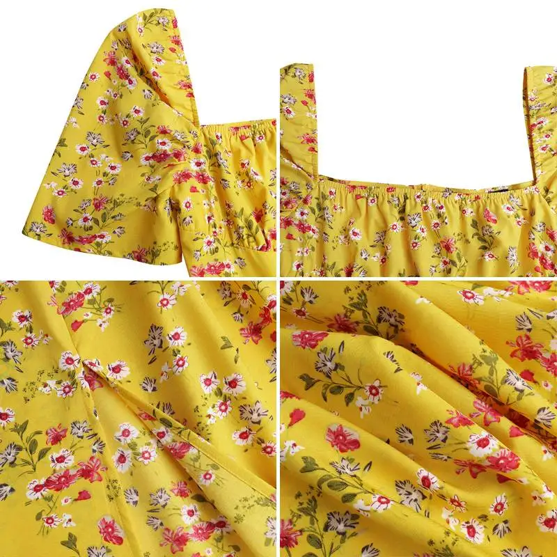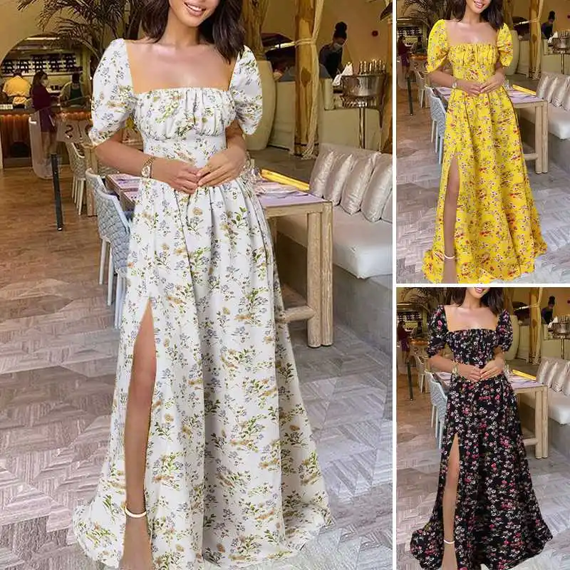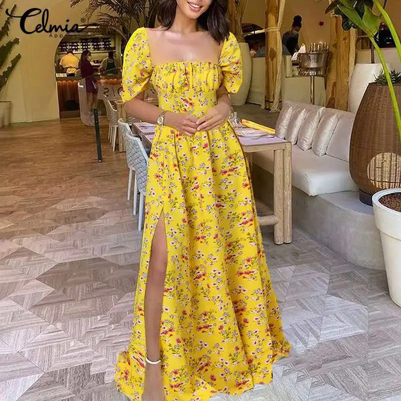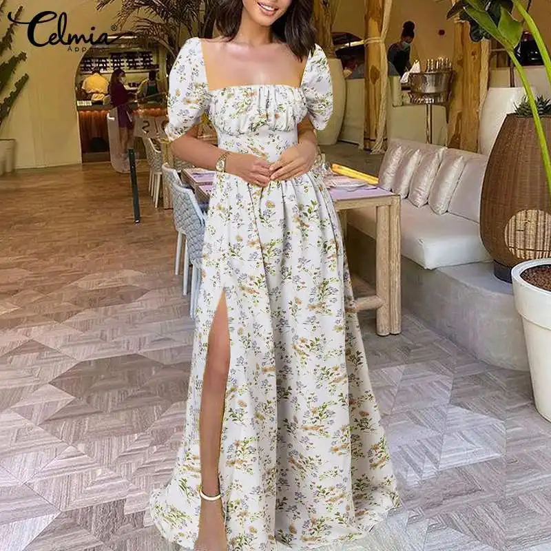 Летнее платье-макси с цветочным принтом Celmia 2021, женский сексуальный сарафан до пола с квадратным вырезом, вечернее плявечерние ное длинное платье с плиссированным подолом и разрезом