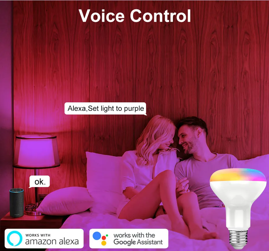 Совместимость с голосовым управлением:ВУмная лампа работает с Alexa Echo, Google Home Assistant, вы можете управлять умной лампой через ваш голос, И просто нужно дать голосовую команду, чтобы включить/выключить или затемнить/осветить ваш светильник (Е. g. "Alexa, установите спальню на синий")
