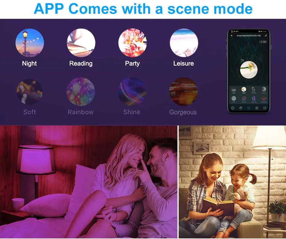 Широкое применение и система сцены:Вы можете установить различные режимы на умный светильник, чтобы соответствовать различным поводам, включая кухню, гостиную, спальню. Умная лампа peteme также может использоваться для настольной лампы, кафе, бара, вечерние и т. д. У этой функции есть цветовая палитра, управление группой, солнечный светильник, таймер, восход, закат, диммируемая яркость, Функция микрофона, DIY режим, режим сцены, энергосбережение...