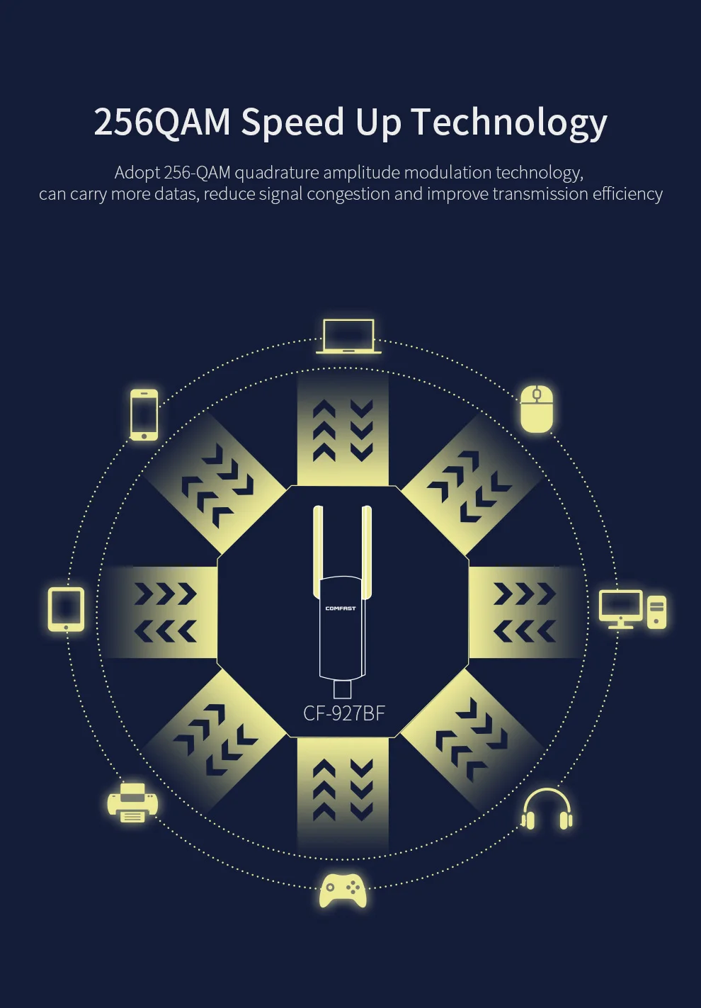 3: Dual Band 5,8 ГГц + 2,4 ГГц: 11ac(867 Мбит/с) и 11n(400 Мбит/с) соединения для ТВ показывает, HD фильмы, Потоковое вещание и онлайн-игр, чтобы избежать радиопомех. Если используется с маршрутизатором 11AC, он может воспроизводить более сильный сигнал.