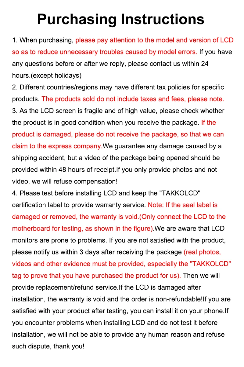 1. При покупке, пожалуйста, обратите внимание на модель и версию ЖК-дисплея, чтобы уменьшить ненужные проблемы, вызванные ошибками модели. Если у вас есть какие-либо вопросы до или после того, как мы ответим, пожалуйста, свяжитесь с нами в течение 24 часов (за исключением праздников).2. Разные страны/регионы могут иметь разную налоговую политику для конкретных продуктов. Проданные товары не включают налоги и сборы, пожалуйста, обратите внимание.3. Поскольку ЖК-экран хрупкий и имеет высокую ценность, пожалуйста, проверьте, находится ли товар в хорошем состоянии, когда вы получите посылка ЛКУ. Если товар поврежден, пожалуйста, не получите посылка, так что мы можем претендовать к Экспресс-компании. Мы гарантируем любые повреждения, вызванные несчастным случаем при транспортировке, но видео о вскрываемой посылке должно быть предоставлено в течение 48 часов с момента получения. Если вы предоставите только фотографии, а не видео, мы откажем в компенсации!4. Пожалуйста, проверьте перед установкой ЖК-дисплея и сохраните сертификационную этикетку «TAKKO LCD», чтобы предоставить гарантийное обслуживание. Примечание: Если этикетка с пломбой повреждена или удалена, гарантия аннулируется. (Для тестирования Подключите только ЖК-дисплей к материнской плате, как показано на рисунке). Мы знаем, что ЖК-мониторы подвержены проблемам. Если вы не удовлетворены продуктом, пожалуйста, сообщите нам в течение 3 дней после получения посылка (должны быть предоставлены реальные фотографии, видео и другие доказательства, особенно тег «TAKKOLCD», чтобы доказать, что вы приобрели продукт для нас). Тогда мы предоставим услугу замены/возмещения. Если ЖК-дисплей поврежден после установки, гарантия аннулируется, а заказ не возвращается! Если после тестирования вы остались довольны товаром, вы можете установить его на свой телефон. Если вы столкнулись с проблемами при установке ЖК-дисплея и не протестировали его перед установкой, мы не сможем предоставить какую-либо причину и отказаться от такого спора, спасибо!5. Меры предосторожности при тестировании:5,1: перед установкой экрана, пожалуйста, извлеките аккумулятор, чтобы перевести устройство в спящий режим, что гарантирует, что данные будут записаны на новый экран.5,2: пожалуйста, осторожно нажмите на экран во время установки. Экран хрупкий. Не снимайте защитную пленку во время тестирования.5,3: перед установкой очистите гибкий разъем ЖК-дисплея спиртом и убедитесь, что он хорошо подключен, прежде чем экран тестирования заработает.5,4: Не тяните за гибкий кабель. Будьте осторожны во время установки, иначе экран будет черным, размытым или не сможет отобразиться.5,5: Закрепление экрана-это веселая и обнадеживающая вещь, но вам также потребуется некоторый опыт, и если это ваша первая попытка установки экрана, мы рекомендуем вам найти профессионального специалиста, который поможет вам установить экран.6. Если товар превышает 7 дней, товар считается использованным. Мы предоставим услугу замены только после получения вашего возврата.7 посылка: ЖК-дисплей, инструменты для обслуживания и подарки