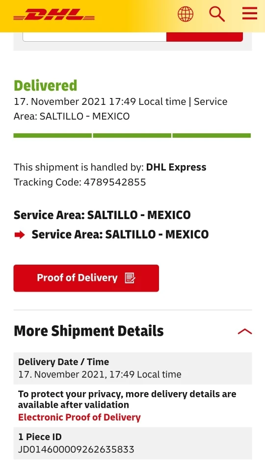 Этот продавец-обманщик, никогда не покупайте с ним. Посылка никогда не была отправлена из Китая на мой правильный адрес. Он был отправлен с другого адреса в той же стране, где я на тот же адрес, на тот, кто отправил его. И ПРОДАВЕЦ винит агента по пересылке в том, что он несет ответственность, когда DHL редко ошибется. Они следуют только инструкциям отправителя. Невозможна доставка посылки из Китая в Мексику в тот же день. Я не единственный случай, прочитайте Другие комментарии других клиентов, и они испытали такую же волну у этого продавца. Надеемся на понимание AliExpress, чтобы предоставить мне полный возврат средств и блокировать этот продавец.