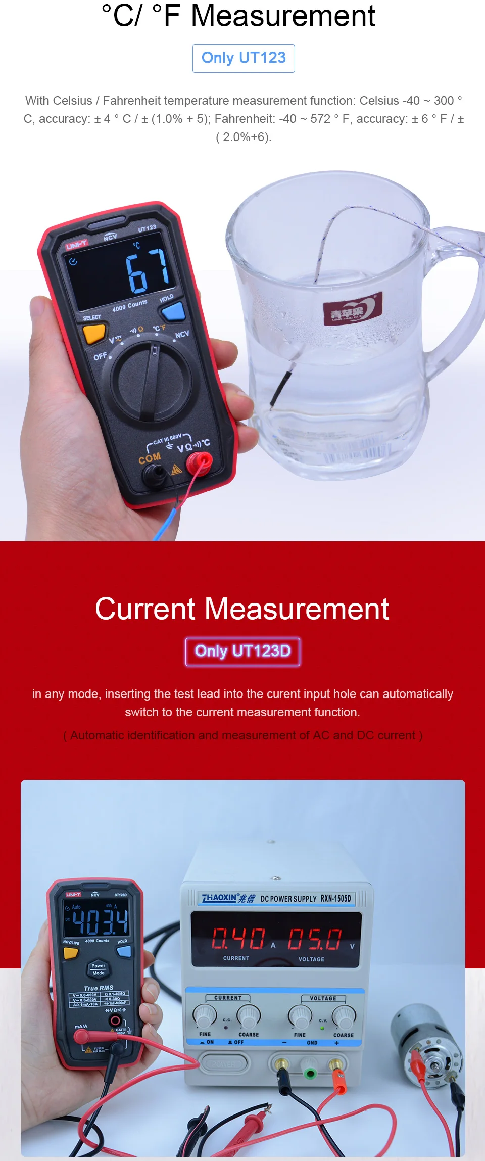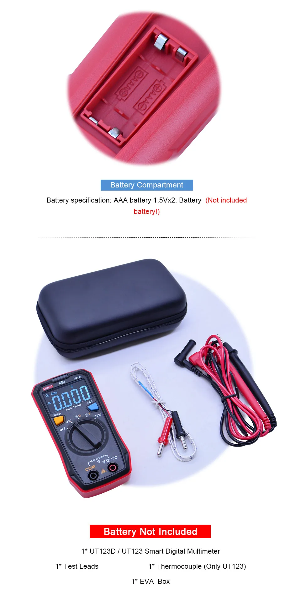 1 карманный цифровой мультиметр UT123 1 * тестовые выводы 1 * Датчик термопары 1 * коробка EVA