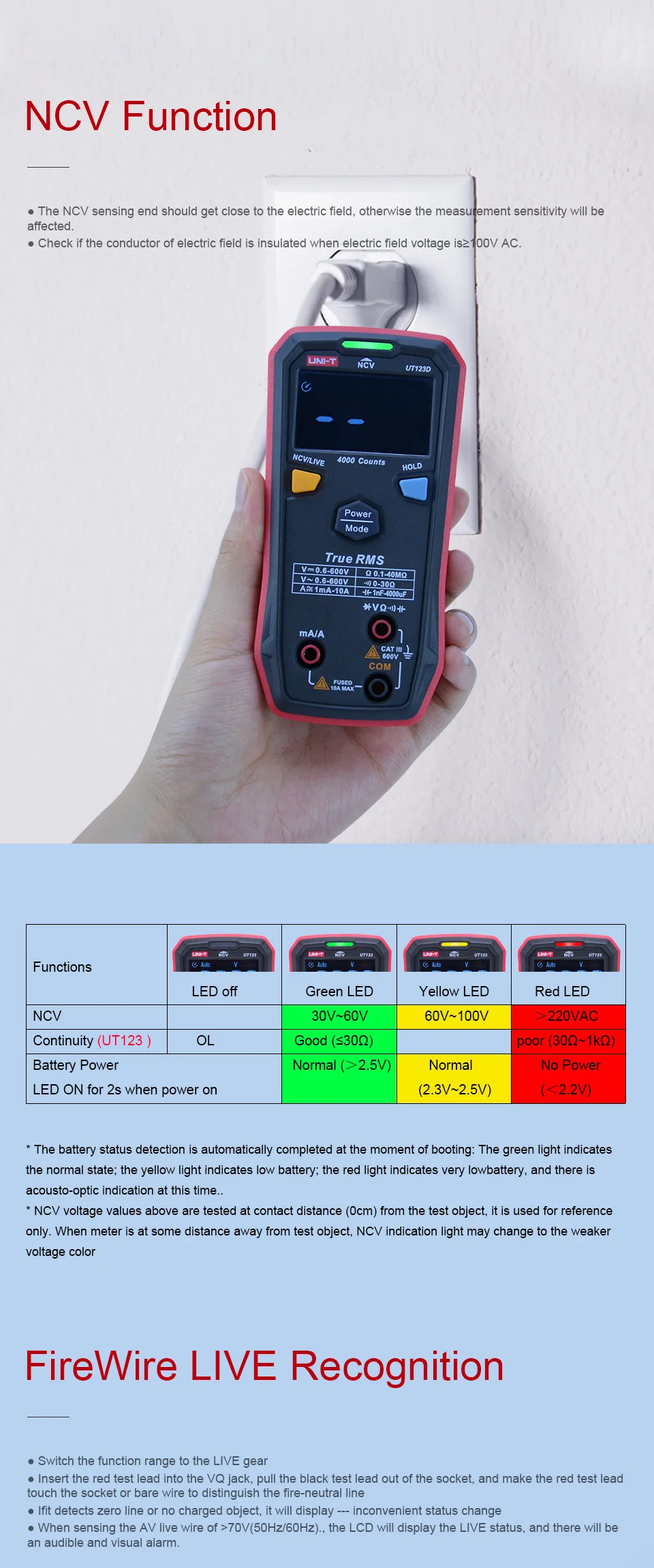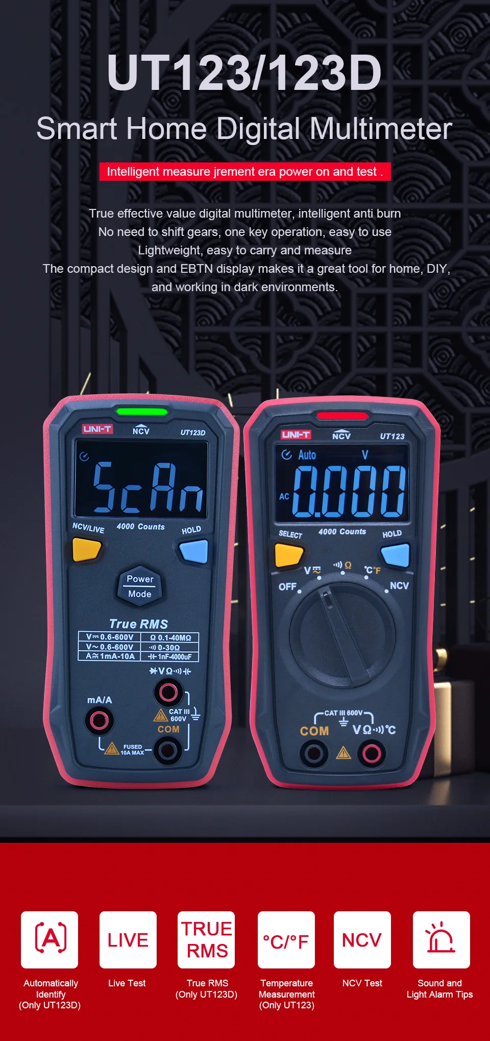 UNI-T Цифровой мультиметр Авто Диапазон жилой мультиметр AC DC резистор напряжения температура NCV тестер UT123/UT123D
