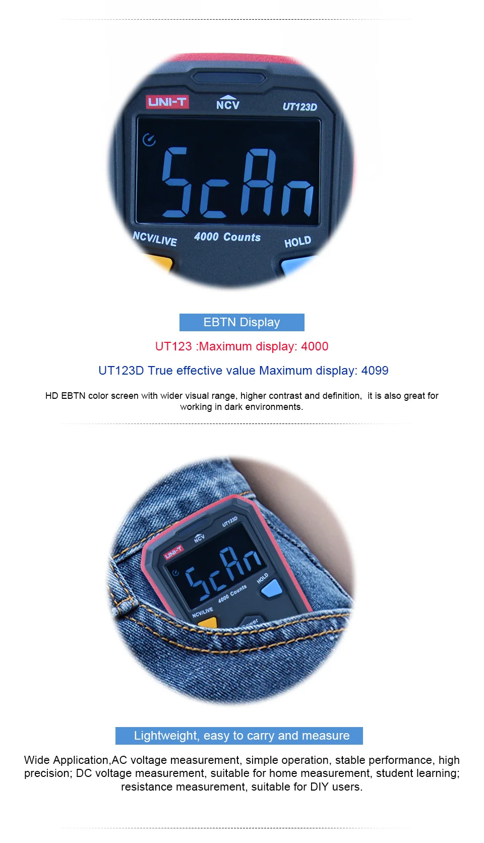Интеллектуальный цифровой мультиметр UT123D предназначен для автоматического определения напряжения переменного/постоянного тока, сопротивления, диода и целостности цепи. Нажатием одной кнопки все режимы измерения можно выбрать вручную, включая емкость. Компактный дизайн и дисплей EBTN делают его отличным инструментом для дома, самостоятельной работы и работы в темноте.