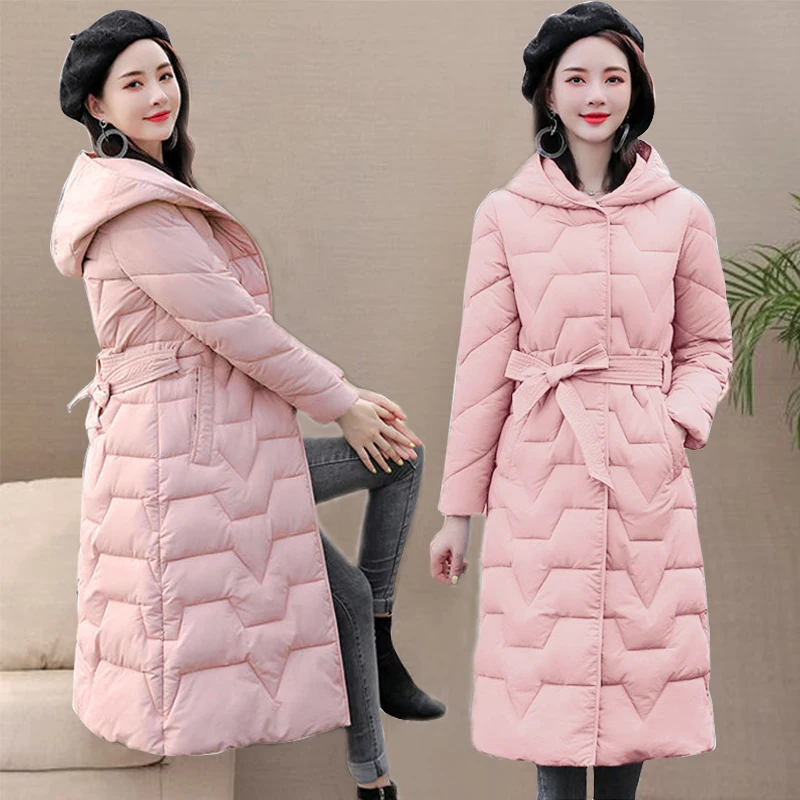 Куртка женская зимняя с капюшоном и поясом, теплая, длинная, розова...