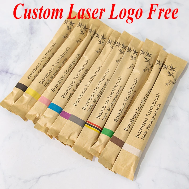 150 шт. Бамбуковая зубная щетка OEM принимает пользовательский лазерный логотип на ручке древесный уголь веганский зуб стоматологические инструменты для ухода за полостью рта пластик бесплатно