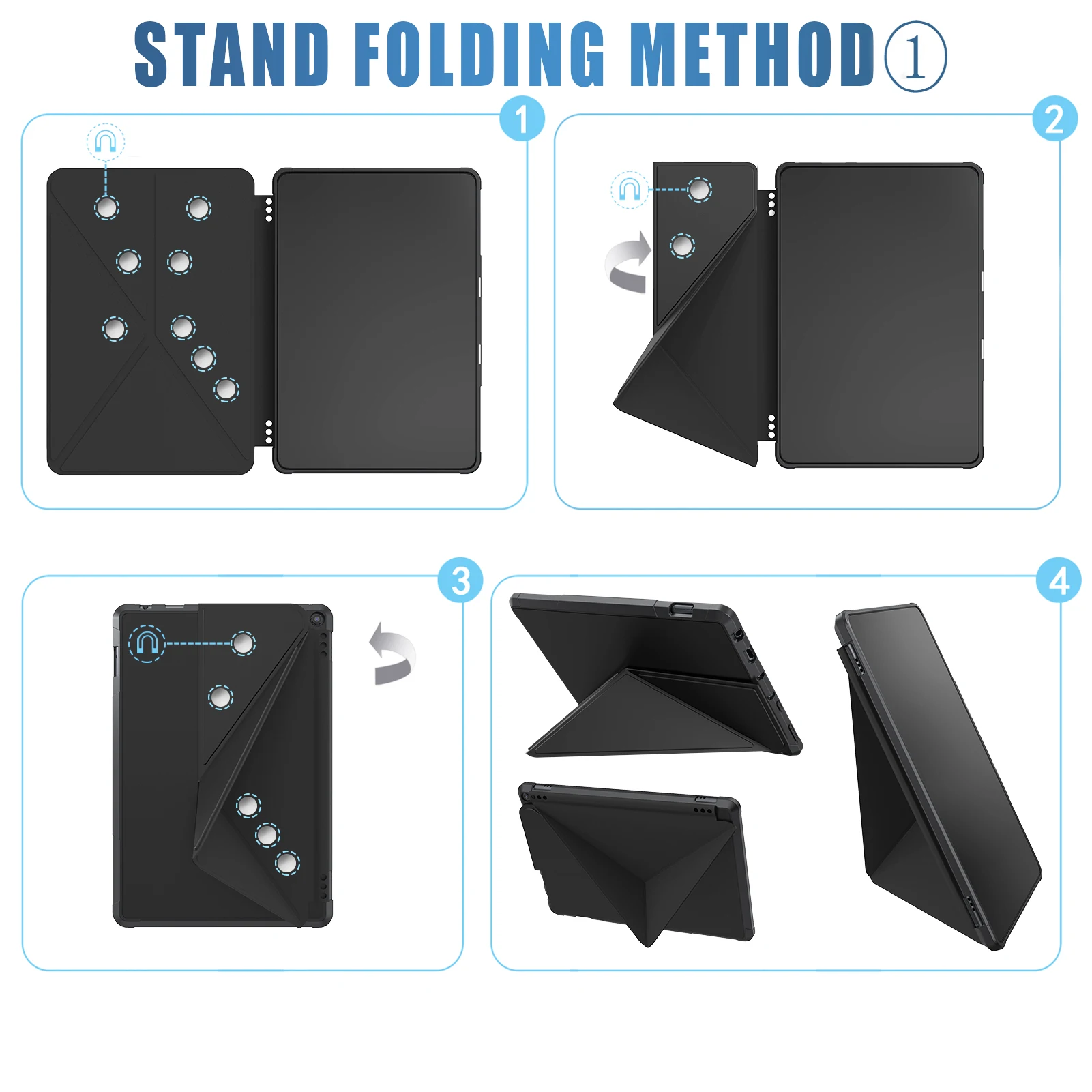 Этот чехол для планшета в стиле оригами имеет множество режимов подставки, таких как горизонтальный и вертикальный. И имеет сильный магнит, который можно прикрепить к металлической поверхности.