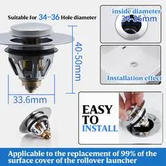 Подходит для сливных отверстий при внутренний диаметр 34 мм-35 мм (1,33-1,38 дюйма)Всплывающий дизайн переворачивает традиционный, неудобный слив (Е. Г. Основная вилка с цепочкой)! Просто нажмите верхнюю крышку вниз мягко, чтобы переключить 2 режима-стопор (чтобы держать воду) и фильтр (для слива воды).