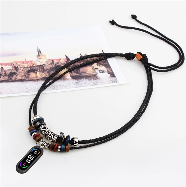 Двойной кожаный шнур с бусинами, плетеный винтажный шнур для ожерелья с резиновым подвесным держателем, чехол для Xiaomi Mi Band 66 NFC