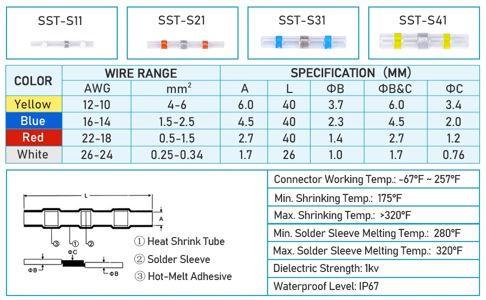 Водонепроницаемый и изоляционныйДизайн, который полиолефиновые трубки снаружи и термоплавкий клей внутри, создает прочное водонепроницаемое уплотнение между проводом и стыковым соединителем, термоусадочное даже во влажной среде.Двухстенные и наружные полиолефиновые трубки обеспечивают изоляцию и повышают прочность на изгиб. Термоплавкий клей и припой внутри обеспечивают плотное соединение проводов и не выскальзывают провода из Термоусадочных стыковых разъемов. Простота в использовании: Термоусадочные Провода соединители упаковываются в мешок в соответствии с различными цветами, что удобно носить и использовать.Соединители провода для уплотнения припоя просто требуют теплового пистолета для завершения соединения, уплотнительные соединители быстро сжимаются и затвердевают при нагревании.
