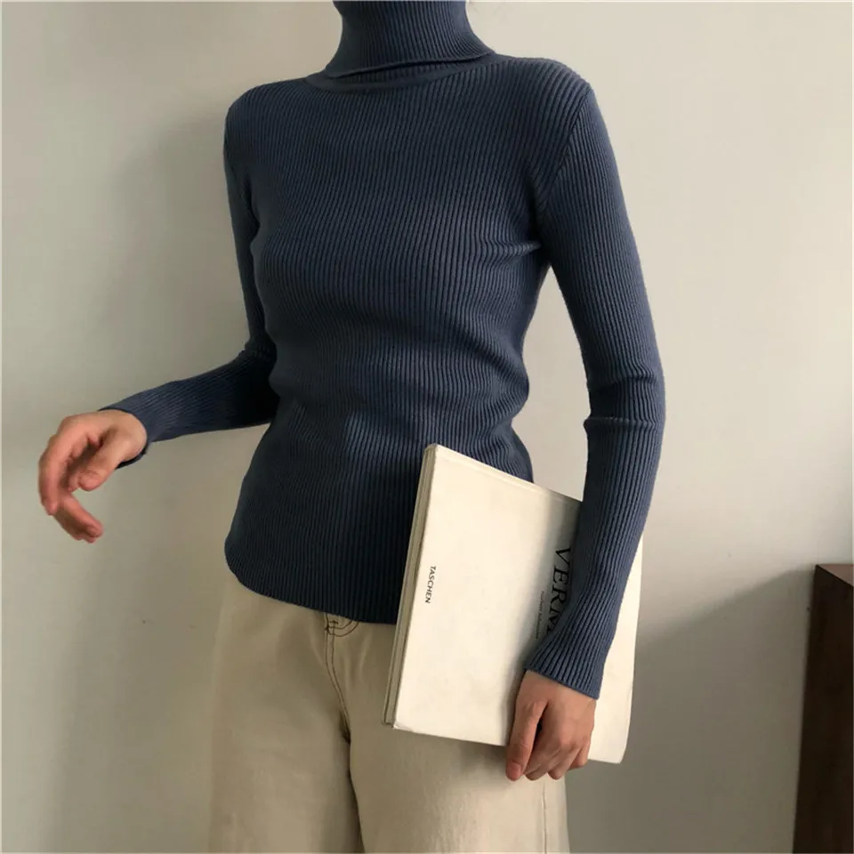 Корейский Зимний вязаный пуловер с высоким воротником, свитер, женские осенние высокоэластичные однотонные облегающие вязаные пуловеры, Топ