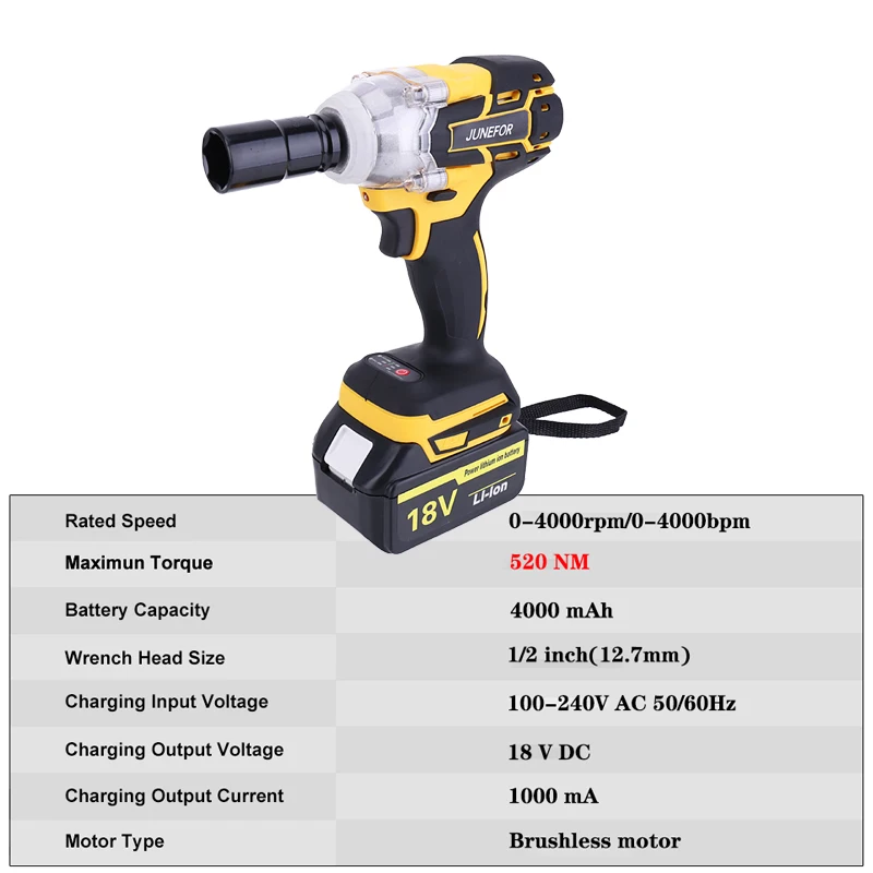 Battery4000mAh Lithium Battery Long Life Wrench, 18V Electric Wrench
