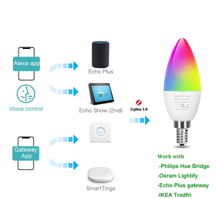 Наши умные светодиодные лампы совместимы с Amazon ECHO Plus ,H * U * E, O * sr * am,SmartThings, ikea, домашний помощник, Zigbee2MQTT ,Tuya zigbee и т. д.