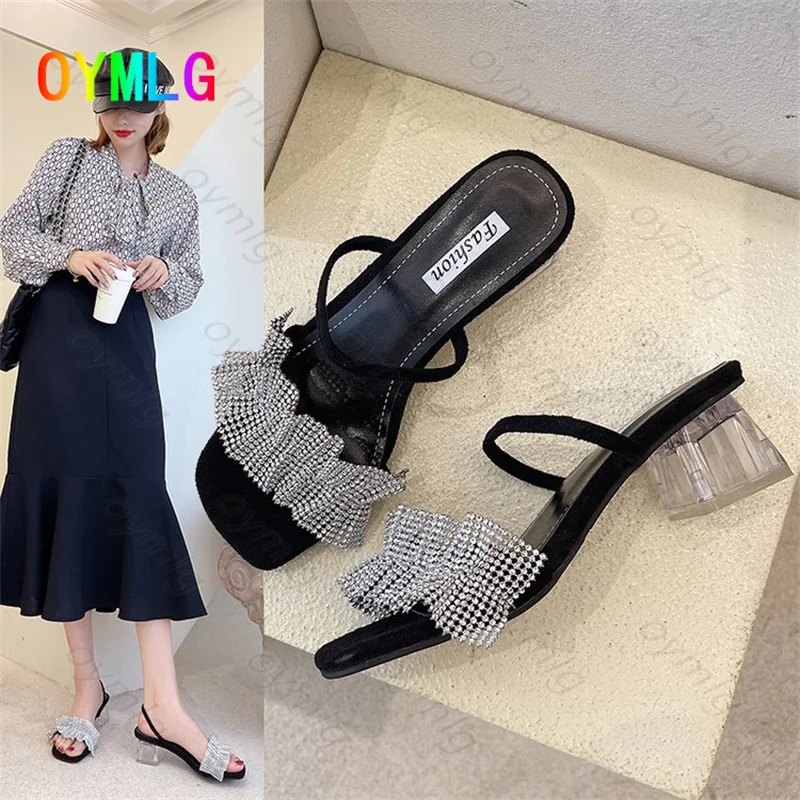Шлепанцы для женщин, модные сандалии с кристаллами, женские туфли на толстом каблуке и двух толстых каблуках, в сказочном стиле, для лета