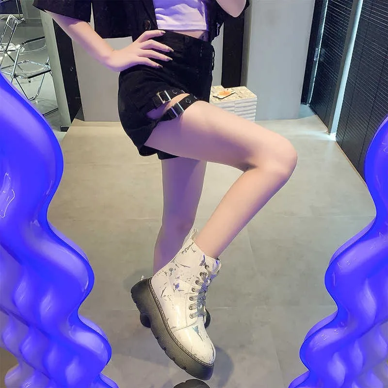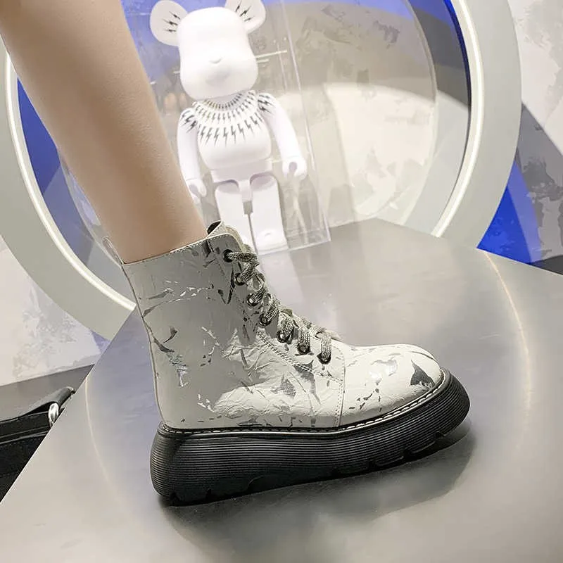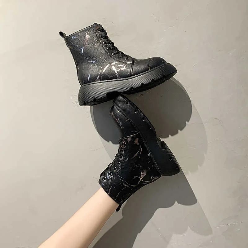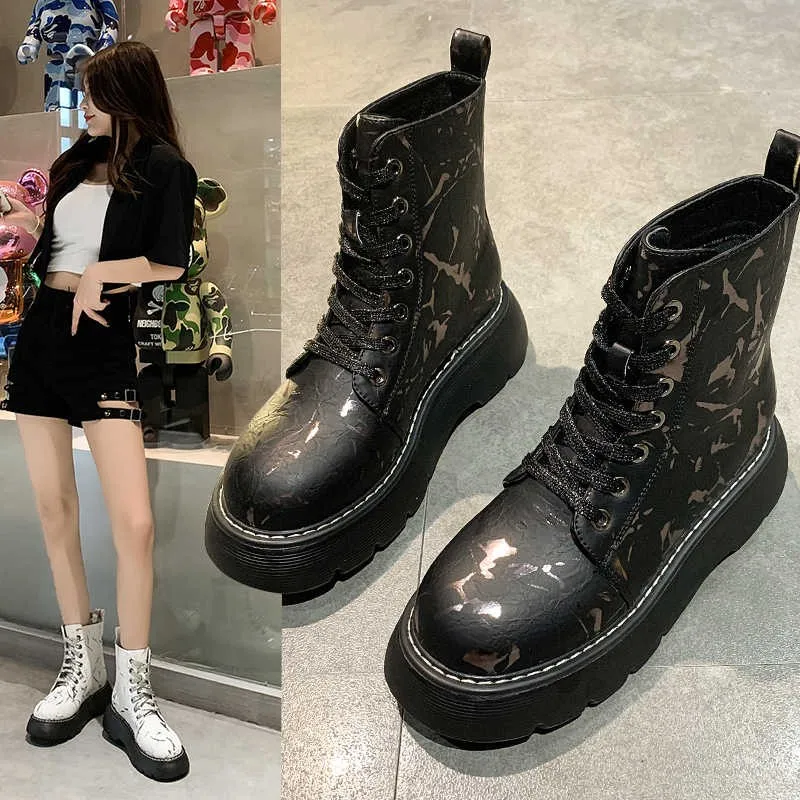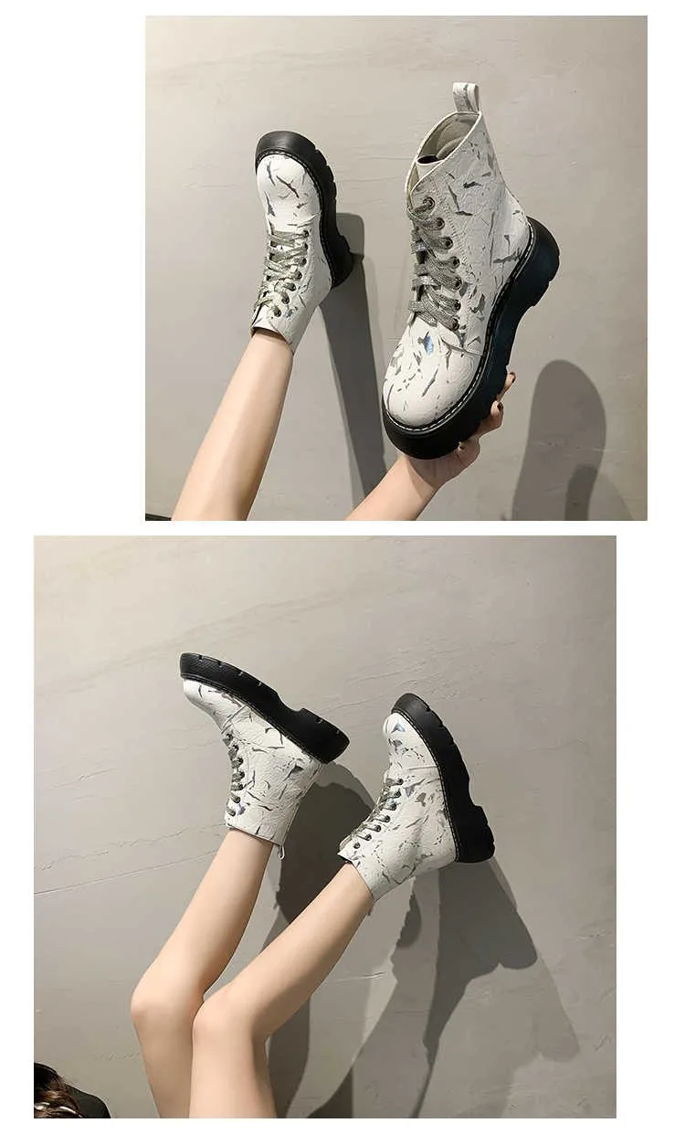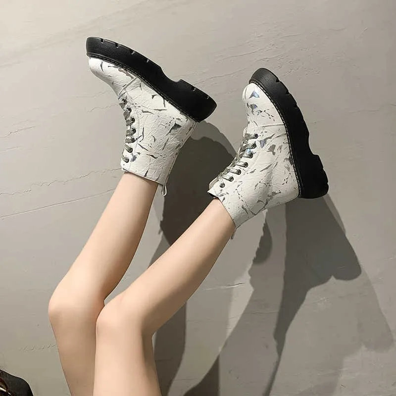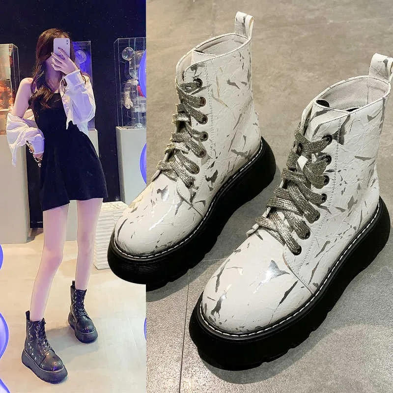 Женские весенние высокие ботинки со шнуровкой, привлекательные высокие ботинки на толстой подошве с принтом и круглым носком, 2021