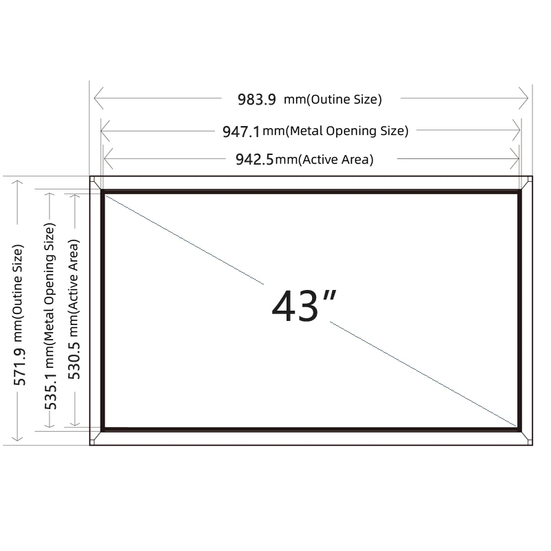 Инфракрасная сенсорная панельСенсорный экран IR-это сенсорная рамка, которая обычно устанавливается перед экраном дисплея. Рамка интегрирована с печатной платой, которая содержит линейку ИК-светодиодов и фототранзисторов Скрытый за рамкой сенсорной рамки. Каждый из ИК-светодиодов и фототранзисторов установлен на противоположных сторонах, чтобы создать сетку невидимого инфракрасного светильник. Рамка защищает части от операцииСупер преимущества для 43 дюймов 20 точек ИК мульти сенсорный экран:20 точек касания (мульти касание)Поддержка увеличения/уменьшения, вращение дисплеяUSB интерфейс, привод бесплатно, подключи и работайПоддержка 20 точек касания под Windows7, Windows8,Windows10 и системой AndroidПоддержка системы Windows XP, Linux и MacOSВыдерживает сильные погодные условияСтабильная калибровка без дрейфаАнтивандальные и износостойкие экраны, идеально подходят для прочных примененийПараллакс-отсутствие производительности для ЖК-дисплеевГерметичный против загрязняющих веществРаботает в различных условиях светильник, крытый и открытый