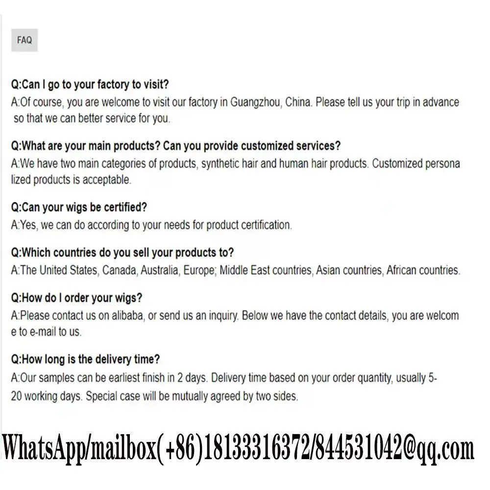 Каждый парик, который вы получаете, производится на нашей опытной фабрике. Каждый парик будет проверен и проверен нашим отделом контроля качества, чтобы убедиться, что нет проблем с качеством перед поставкой.