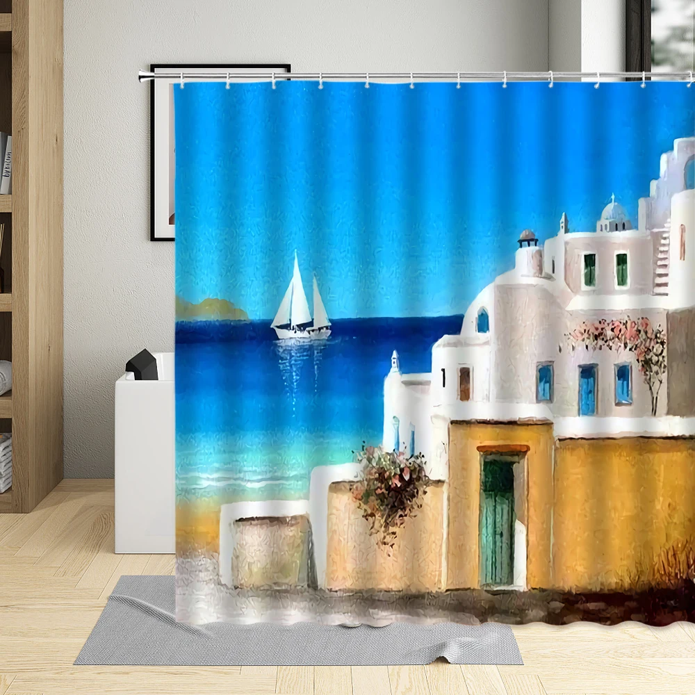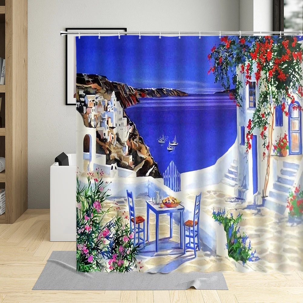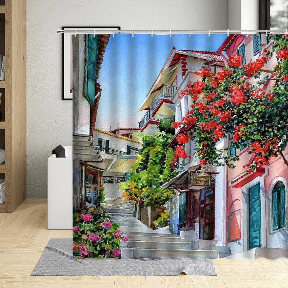 Занавеска для душа с изображением греческого города, улицы, цветов,...