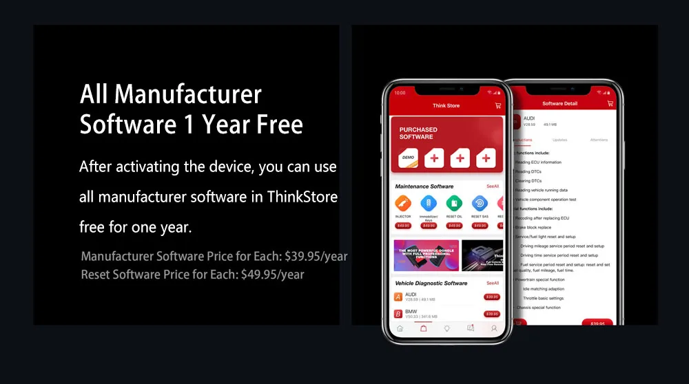 После активации устройства вы получите все программное обеспечение от производителя. Вы можете выбрать любой производитель программного обеспечения в ThinkStore и вы можете использовать их бесплатно в течение одного года.Цена производителя программного обеспечения для каждого: $39,95/годСброс ЦЕНЫ программного обеспечения для каждого: $49,95/годЦена всего программного обеспечения (все автомобильное программное обеспечение и все программное обеспечение сброса + бесплатное обновление): $99,00/1 год $139,00/2 года