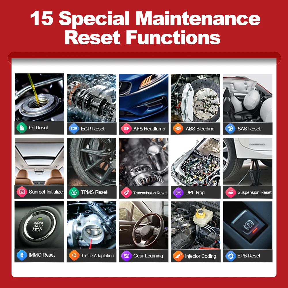 Этот сканер OBD2 специально разработан, чтобы обеспечить вам быстрый доступ к системам транспортных средств для различных плановых услуг и обслуживания. Есть некоторые часто используемые специальные службы сброса перечислены для вашей справки:1. Обслуживание сброса масляной лампы: позволяет выполнить сброс для нового расчета системы жизнедеятельности моторного масла после изменения масла.2. Обслуживание EPB: важно в обслуживании безопасности и эффективности электронной тормозной системы.3. Батарея летучей мыши: позволяет сканировать инструмент для оценки состояния заряда батареи, контролировать ток замыкания, зарегистрировать замену батареи и активировать остальное состояние транспортного средства.4. Обслуживание DPF: специально работает для дизельной системы фильтров твердых частиц с регенерацией DPF, замена компонентов DPF после замены блока управления двигателем.5. Обслуживание SAS: помогает очистить воспоминания о датчике угла поворота и играет важную роль в калибровке датчика угла поворота руля.6. Обслуживание TPMS: имеет смысл в отображении сенсорных идентификаторов из ECU транспортного средства, ввод TPMS сенсорных сменных идентификаторов и датчиков тестирования.7. Программирование ключей IMMO: уникальное Программирование автомобильных ключей и функция считывания ПИН-кода, оно в основном используется для отключения потерянных ключей транспортного средства и программирования нового сменного ключа fob.8.ABS кровотечение: ABS тормозное кровотечение, чтобы получить твердую тормозную колодку После истощения воздуха после ремонта ABS насосной системы9. Сброс солнечного крыши: память солнечного крыши, как правило, необходимо сбросить, когда батарея транспортного средства заменена или машина умирает10. Сброс подвески: попробуйте сброс электронной Подвески с системой массажа закройте все двери koeo flip через систему measage перейти к сбросу подвески или выключению11. Сброс коробки передач: процесс сброса передачи Адаптивное обучение DIY. Запуск автомобиля и вождение. Как только вы выполните эту процедуру, блок управления двигателем (ECU) и блок управления передачей (TCU) будут работать вместе, чтобы узнать, как Вы управляете, отслеживая ваш шаблон вождения. После того, как вы выполните этот метод программирования TCU / ECU привод автомобиля.12. Сброс фар AFS: «AFS» означает адаптивную переднюю систему освещения (ночью с би-ксеноновыми фарами), она поворачивается с обеих сторон, нажатие этой кнопки означает, что они не поворачиваются вперед и не поворачиваются, когда вы поворачиваете руль13. Кодирование инжектора: утечки инжекторов и некоторые мертвые инжекторы могут быть пропущены даже когда инжектор отключен. Другие проблемы с системой зажигания и механическими компонентами также могут не показывать потерю оборотов в минуту при выключении инжектора14. Приспособление дроссельной заслонки корпус дроссельной заслонки представляет собой трубу, содержащую поворотный плоский клапан (бабочка), который используется для контроля количества воздуха, входящего в двигатель. В автомобиле с электронным топливом Датчик положения дроссельной заслонки и датчик воздушного потока связываются с компьютером, который поставляет соответствующее количество топлива, необходимое для инжекторов. Необходимо повторно изучить положение датчика дроссельной засл