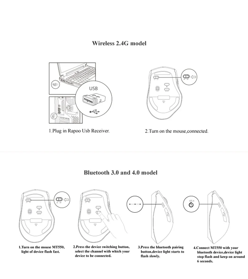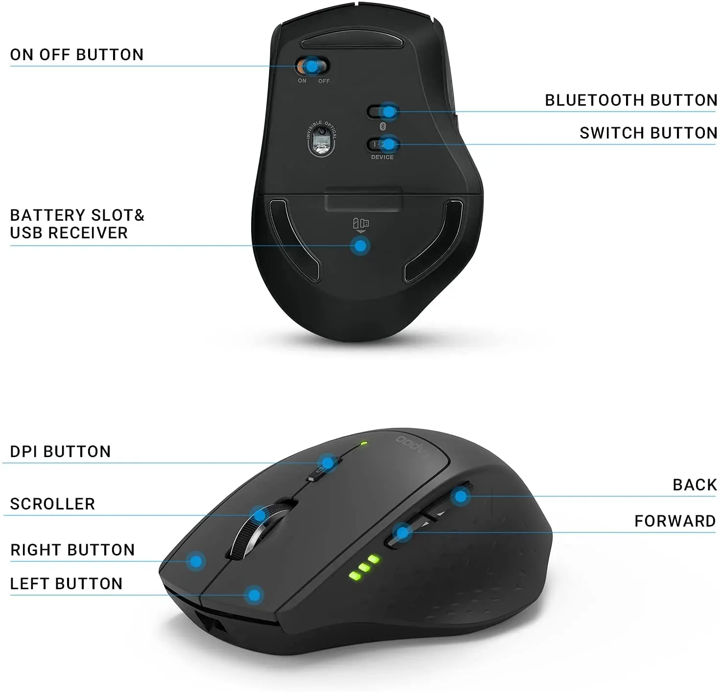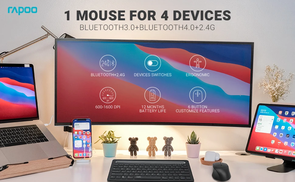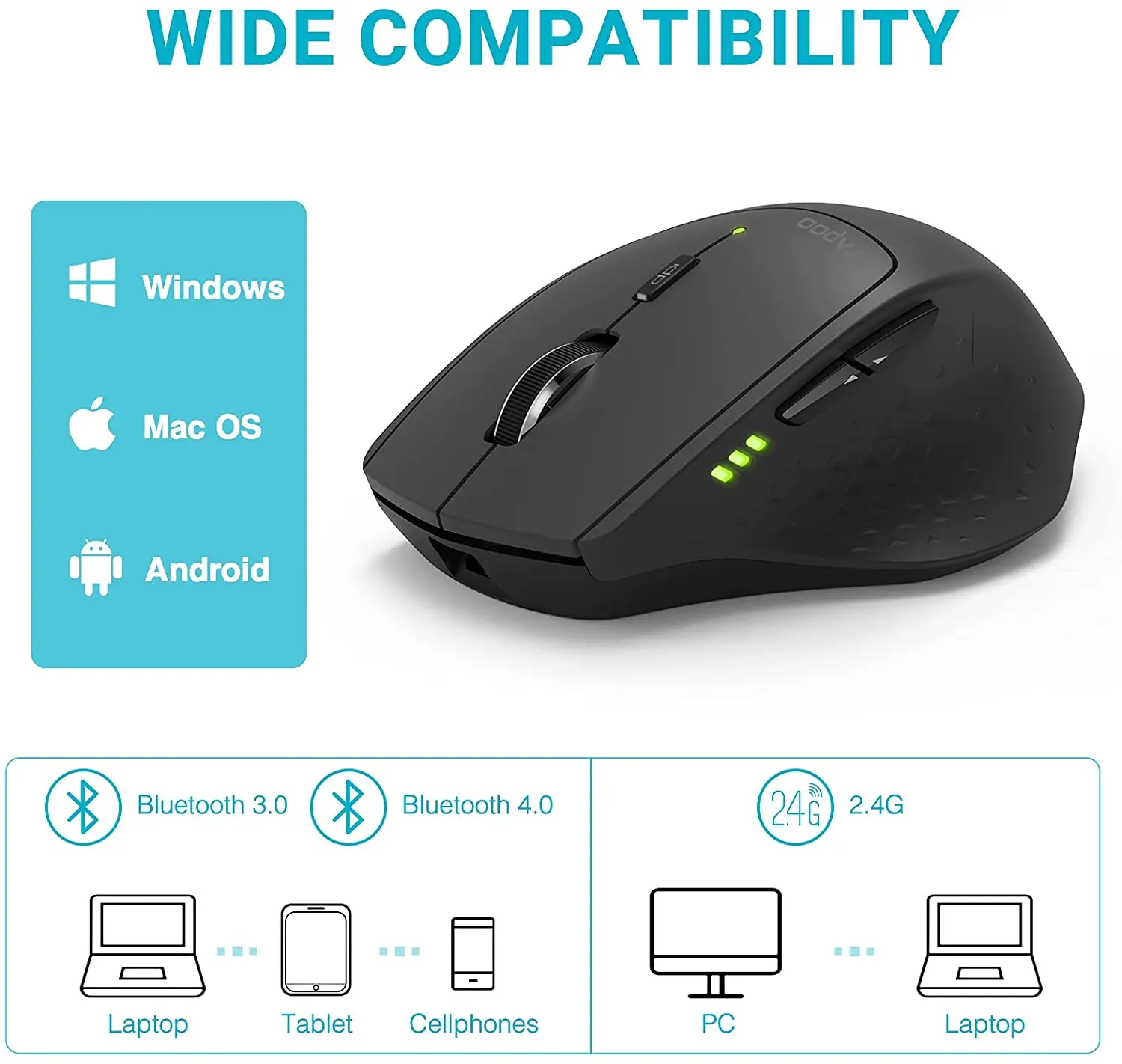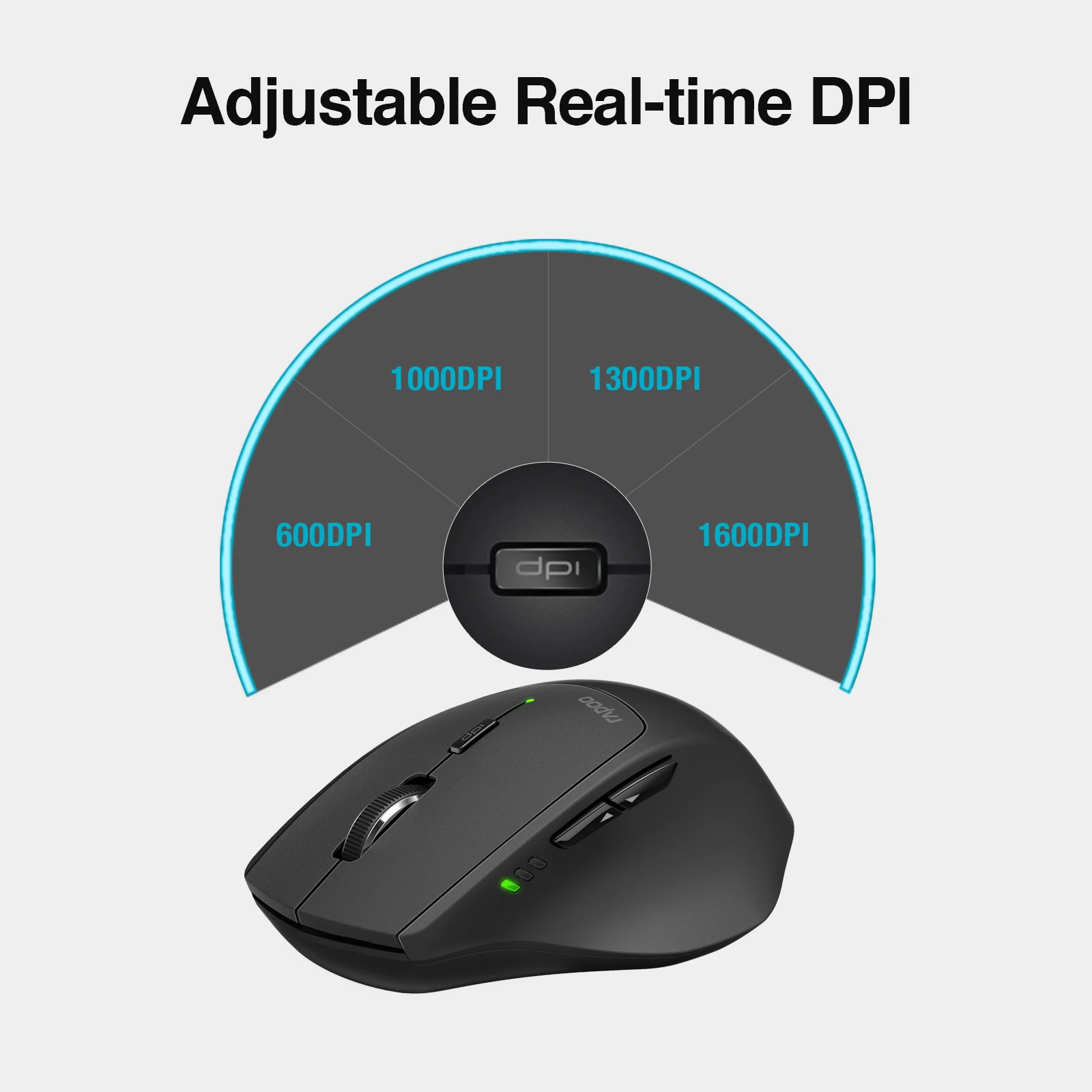Мышь RAPOO, многорежимная, Bluetooth, для подключения до 4 устройств, 4 регулируемых DPI, эргономичный дизайн, беспроводная мышь с аккумулятором на 12 месяцев