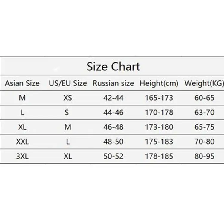 Примечание: наш размер-это Азиатский размер. Азиатский размер примерно на 1-2 размера меньше, чем размер США, ЕС, Бразилии, России. Если вы не знаете, как выбрать размер. Пожалуйста, сообщите мне ваш рост и вес.