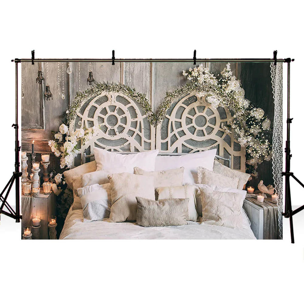 Рождественский фон Mehofond с белой кроватью, подушкой, цветочным изголовьем, деревянная стена, свеча, фон для семейного портрета, фотография, украшение