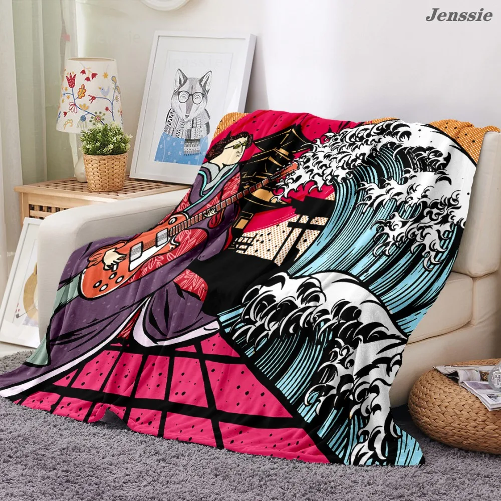Покрывало Фланелевое в японском стиле, с рисунком из шерпы ландшафт с морскими волнами, для дивана, телевизора, плюшевое, для взрослых, размер 130x150 см