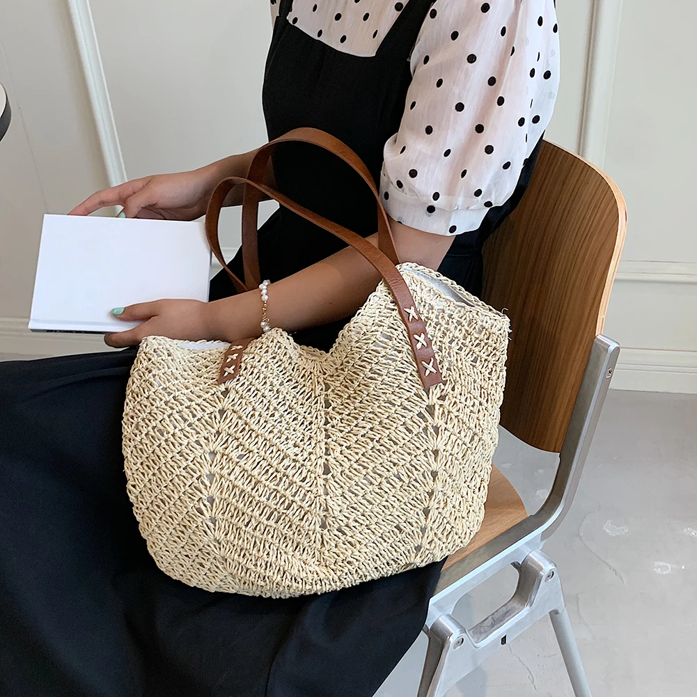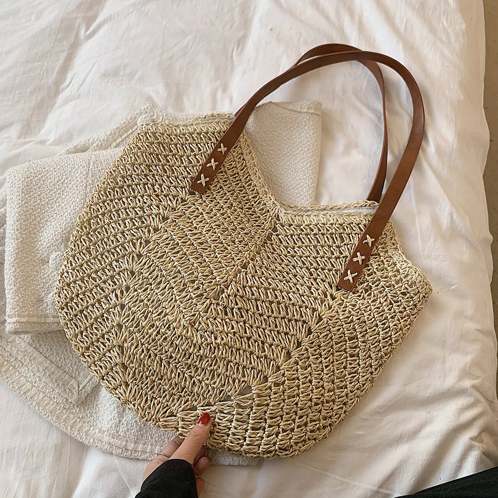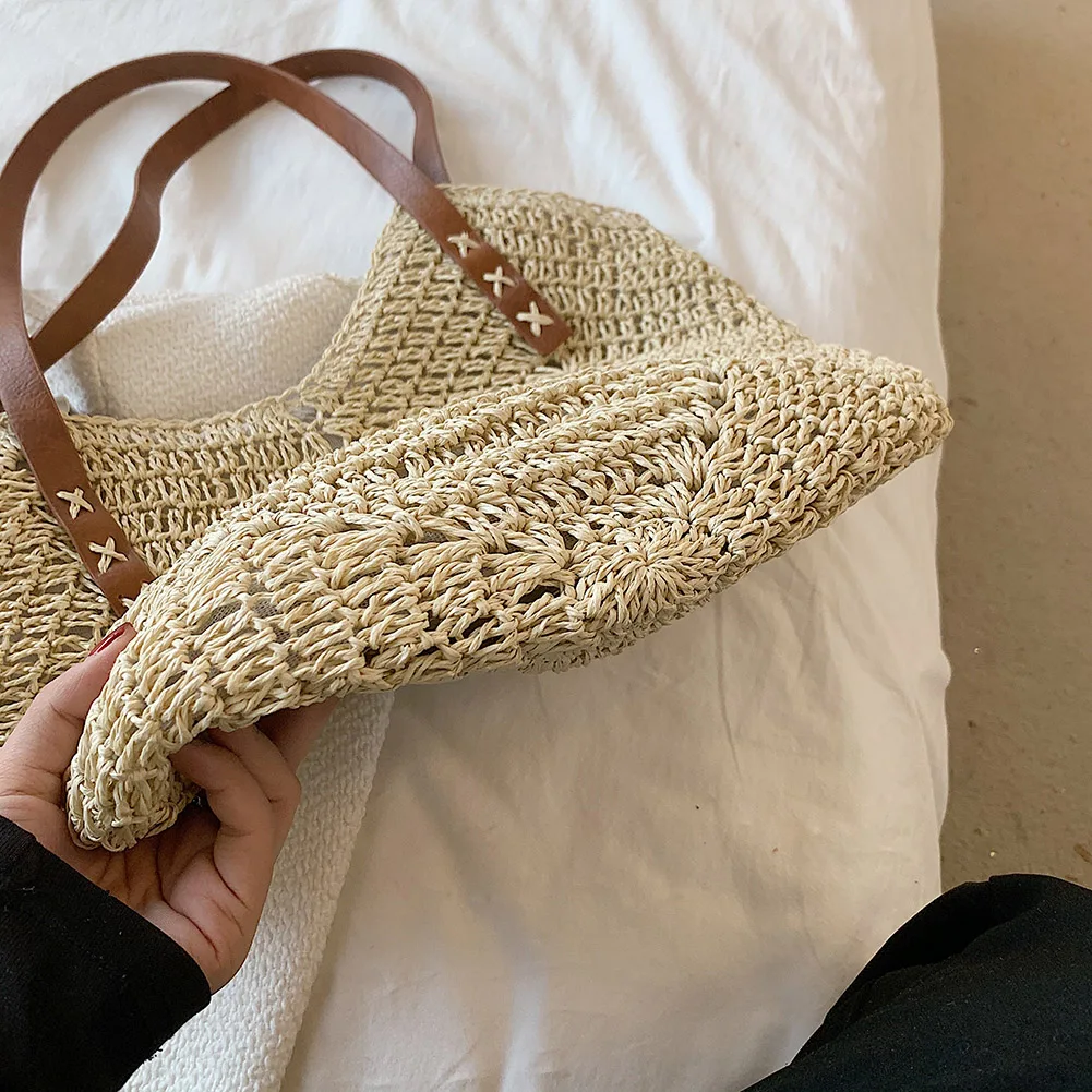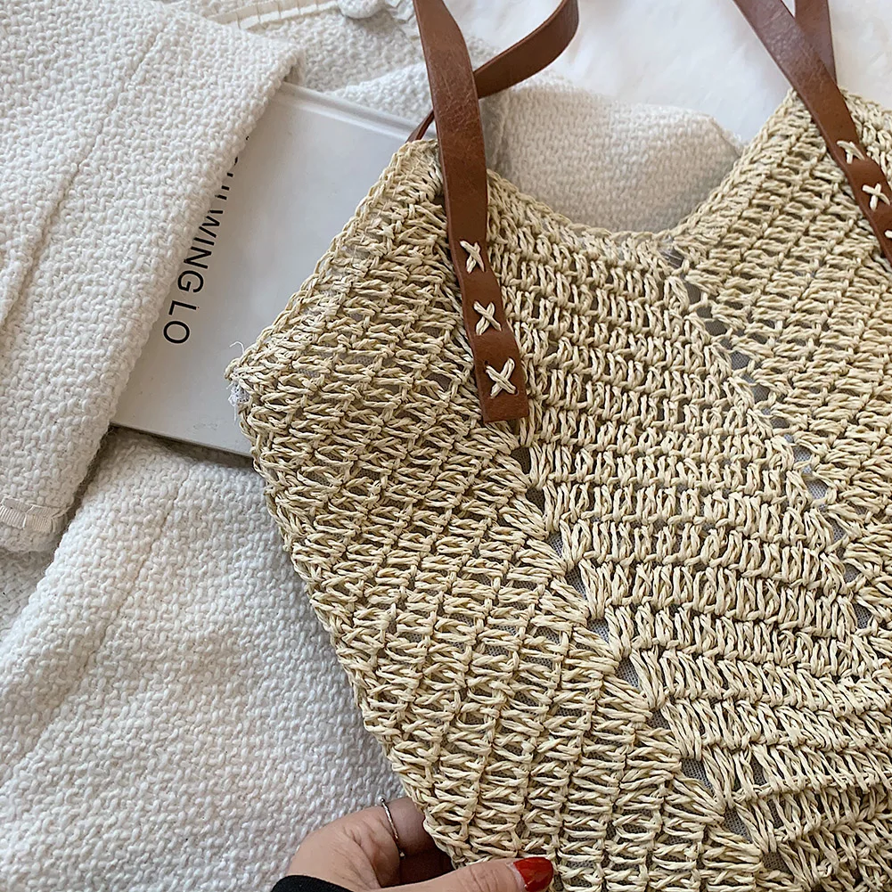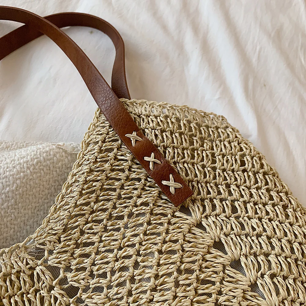Летние богемные винтажные плетеные женские вместительные сумки через плечо, Модные ажурные соломенные женские пляжные дорожные сумки