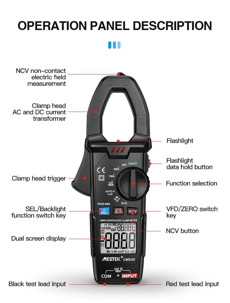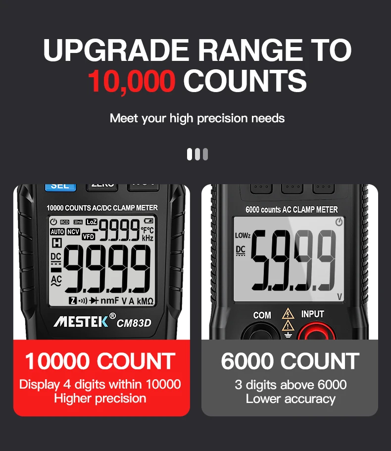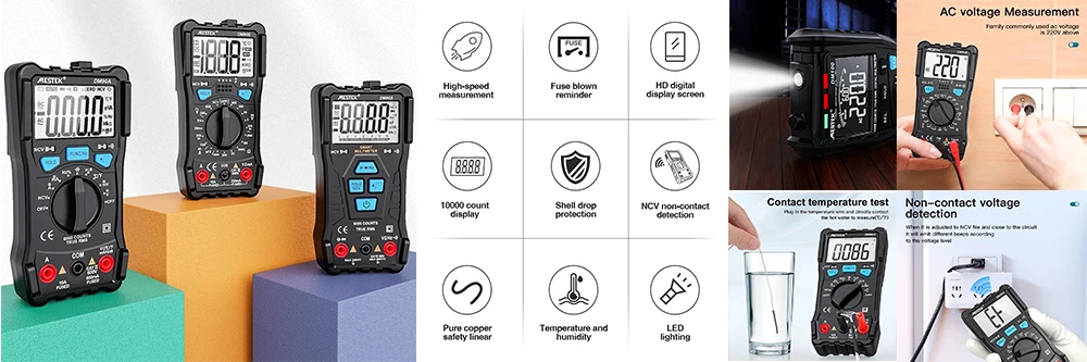 Smart rang, Авто диапазон, 10000 отсчетов, AC/DC ток, AC/DC напряжение, сопротивление, емкость, измерение температуры, частота, RCD,TRUE-RMS, авто-Vloz