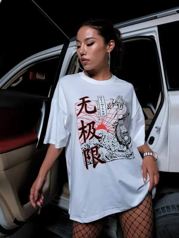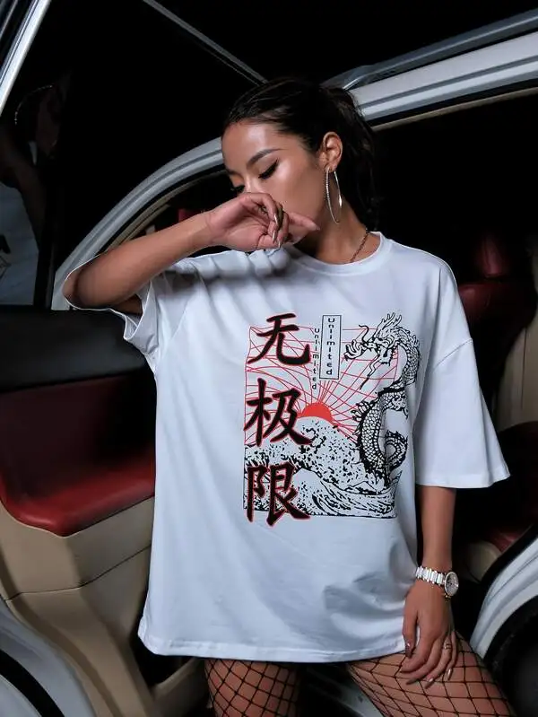 Женские футболки с принтом дракона, уличные топы, футболка оверсайз...