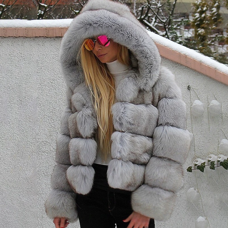 Шуба женская из натурального синего лисьего меха, с капюшоном, тепл...