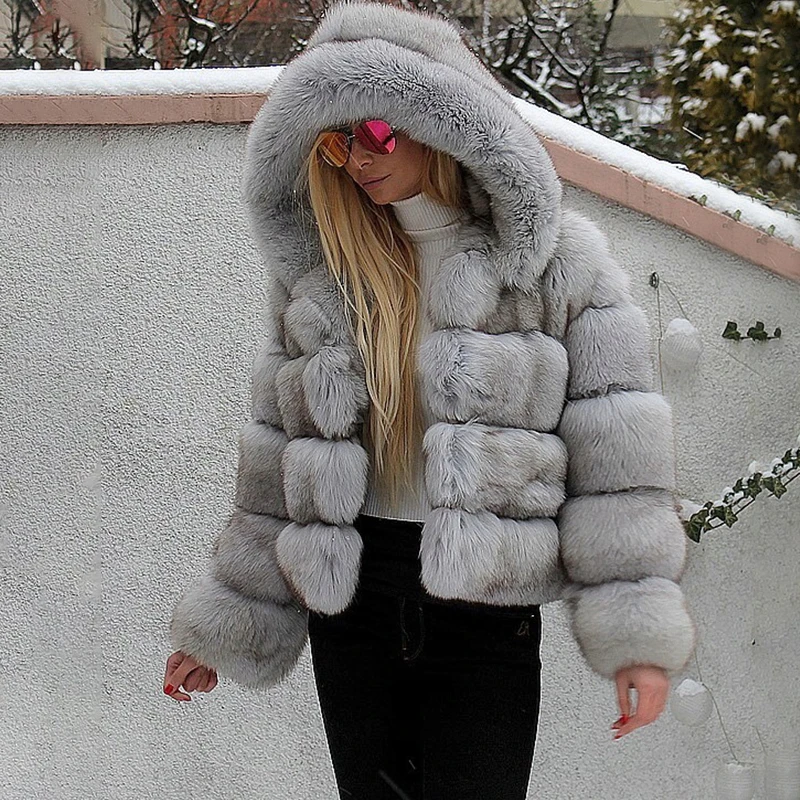 Женское серое пальто из натурального Лисьего меха с капюшоном, толс...
