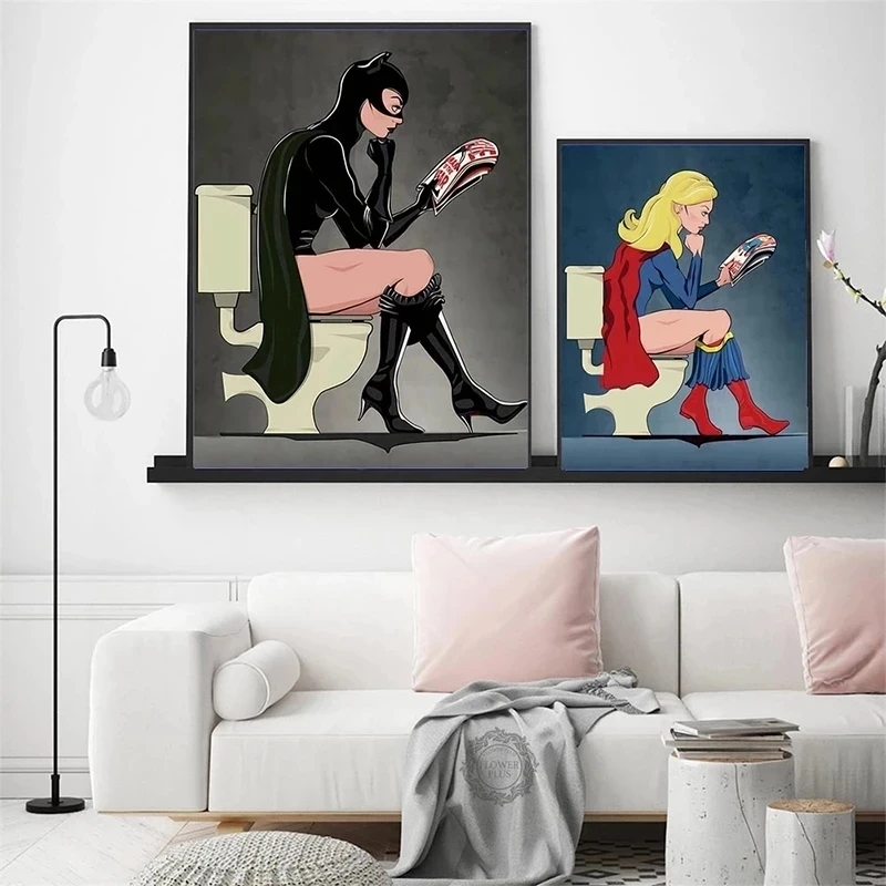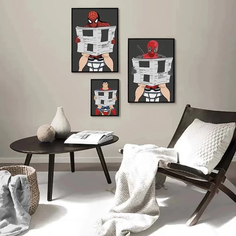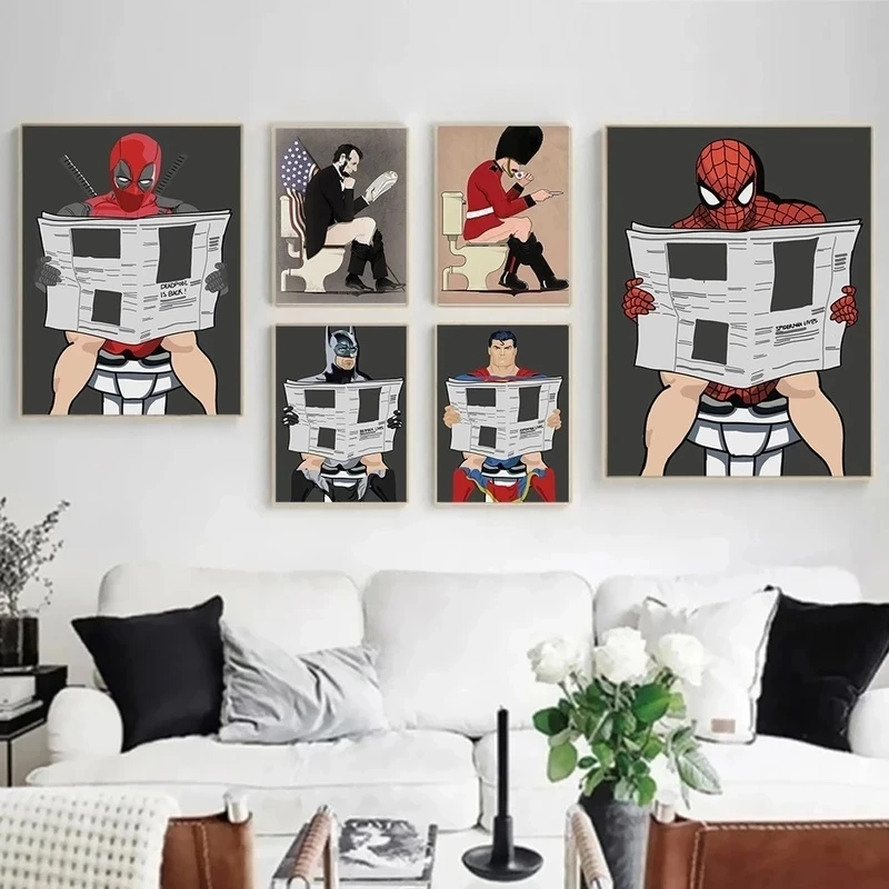 Художественные постеры с забавными Мстителями, Человек-паук, супергероями, принты, журнал для чтения персонажей в туалете, Картина на холсте, домашний декор