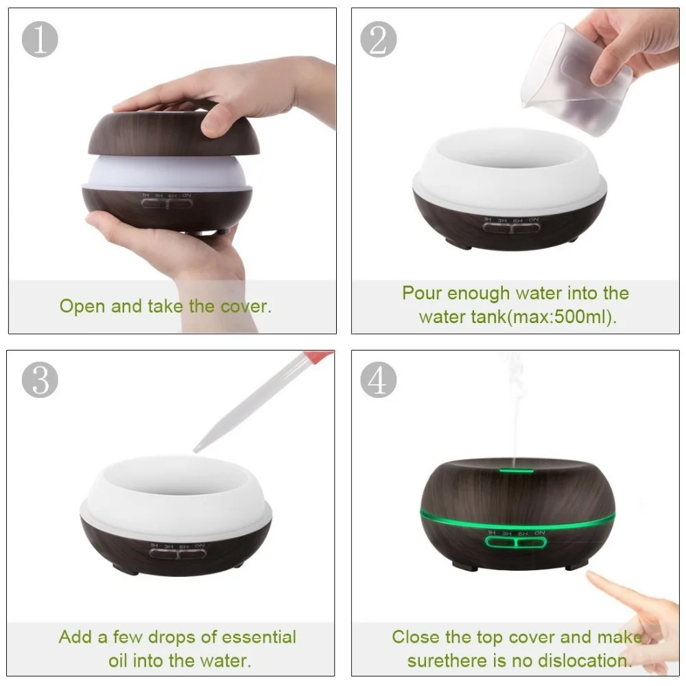 Длинный пресс «Туман» 1 звуковой сигнал в сильном тумане, 2 звуковых сигнала в маленьком тумане Кнопка «светильник»: нажмите кнопку «светильник», чтобы включить светодиодный светильник, и цвет будет автоматически циклироваться. Нажмите кнопку еще раз, чтобы вручную установить предпочтительный цвет и яркость дисплея. Удерживайте кнопку, чтобы выключить светильник. Посылка в комплекте Аромадиффузор-1 шт. 1 х адаптер 1 x Руководство пользователя(Не включая эфирные масла)