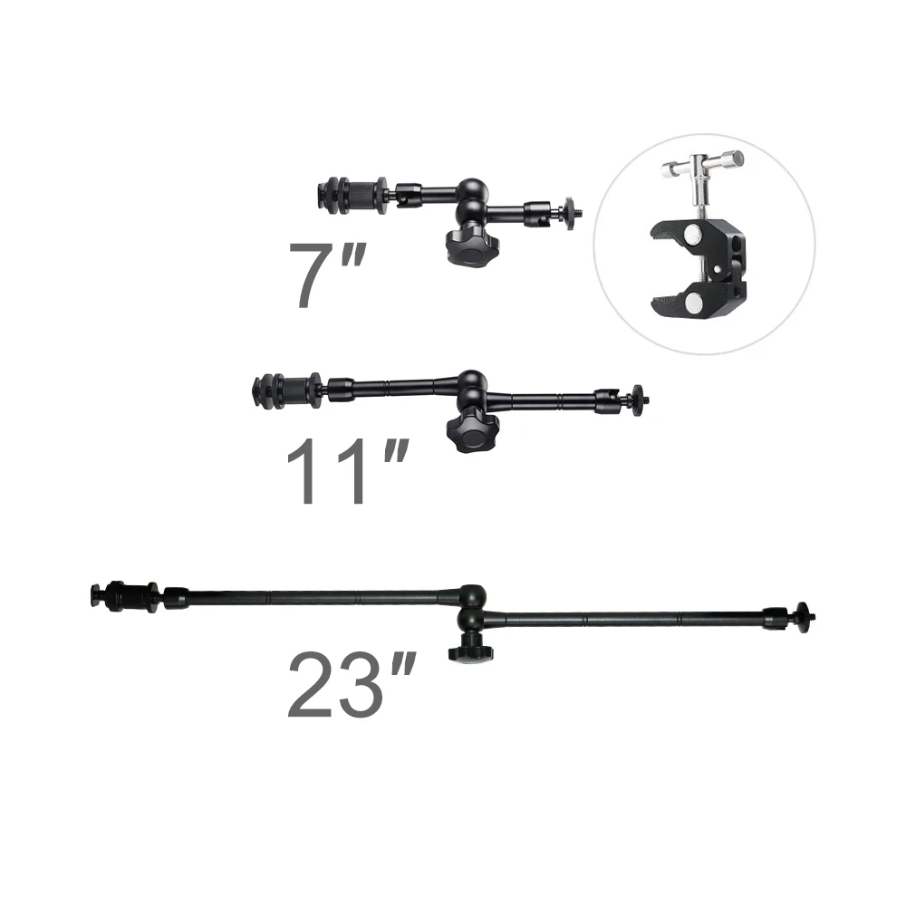 Описание:Прочный и прочный-он хорошо обработанный металл, который изготовлен из жесткого анодированного алюминиевого сплава, он не будет легко страдать от коррозии или поломки.MAGIC ARM-одна сторона имеет 1/4 "винт, соединяющийся с монитором, светодиодный светильник или другие аксессуары. Другая сторона-это квадратное крепление для горячего башмака, которое можно легко установить на камеру DSLR. И это крепление для горячего башмака является съемным, чтобы стать еще одним винтом 1/4 ", поэтому оба конца-винт 1/4", который вы можете подключить к различному оборудованию.Легко управлять-Эта волшебная рука с блокирующими ручками управления, чтобы снять или увеличить напряжение, которое может дать все движения положения. Эта шарнирная Волшебная рукоятка с двумя гладкими шариковыми головками на 360 ° упрощает монтаж, размещение и регулировку любых осветительных приборов на камере и других аксессуаров.Широко используется-Magic Arm Articulating фрикционный рычаг с крепление для горячего башмака идеально подходит для DSLR камеры Rig, ЖК-монитора, DV монитора, светодиодный свет, вспышки, микрофоны, смартфон и многое другое.SUPER CLAMP-magic arm clamp имеет гнездо 1/4-20 и 3/8-16, оба стандартных размера фитинга в фотостудии для головок и штативов используется для различных насадок. Как камеры, 15 мм стержни, светодиодные фонари, зонты, крючки, полки, Пластины стекла, поперечные стержни и т. Д.Легко управлять-этот точный и прочный спроектированный Супер зажим с фиксационными ручками для освобождения или увеличения напряжения, который может дать все движения положения, отличный патрон, чтобы легко и быстро поймать объект.Спецификация:Цвет: черныйМатериал: металл + АБСДиапазон зажима: прибл. 55 мм/2,16 дюйма7 "Волшебная рука длина: прибл. 185 мм/7,28 дюйма11 "Волшебная рука длина: прибл. 285 мм/11,22 дюйма23 "Волшебная рука длина: прибл. 590 мм/23,22 дюймаПримечание:Камера и другие аксессуары не включены;Перед заказом выберите правильный вариант.Посылка включает в себя:Набор A: волшебная рука 1*7"Комплект B: 1*11 "Magic ArmНабор C: 1*23 "Magic ArmКомплект D: 1*7 "Magic Arm, 1 * Супер ЗажимНабор E: 1*11 "Волшебная рука, 1 * Супер ЗажимНабор F: 1*23 "Волшебная рука, 1 * Супер ЗажимНабор G: 1 * Супер Зажим