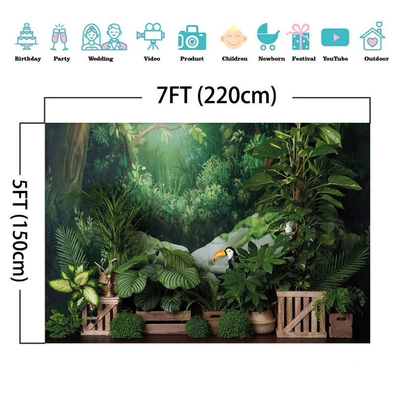 Фон для детской вечерние съемки с изображением диких джунглей, сафари, зеленых растений, лесных животных, тортов