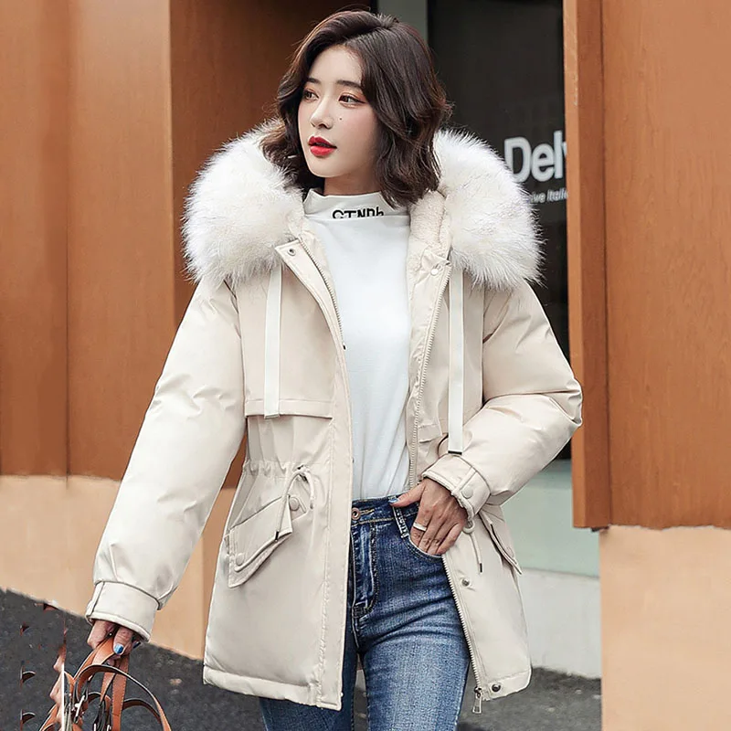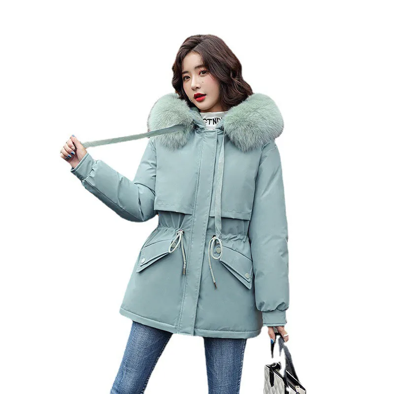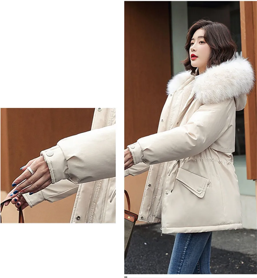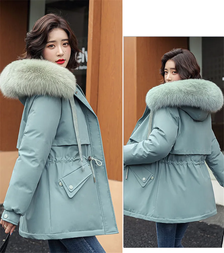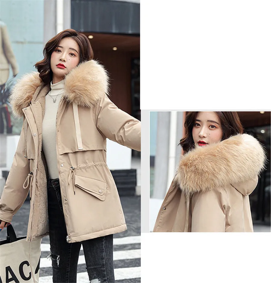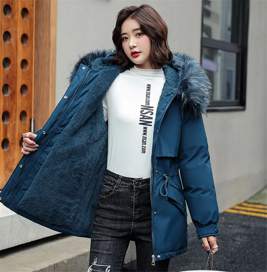 Женская куртка с меховой подкладкой, свободная хлопковая куртка с капюшоном и меховым воротником на толстой подкладке, зима 2022
