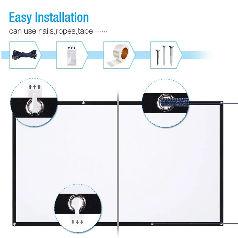 Очень легко устанавливается экран проектора, вы сможете развернуть экран и установить его буквально за минуты, можно повесить на стену с помощью крючков (входит посылка. Экран подходит для использования внутри и снаружи помещений