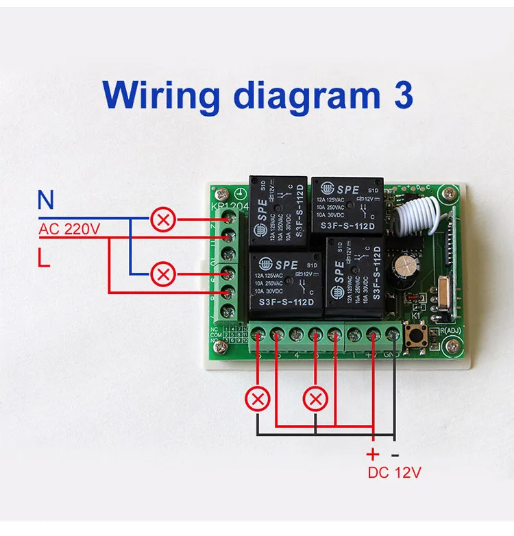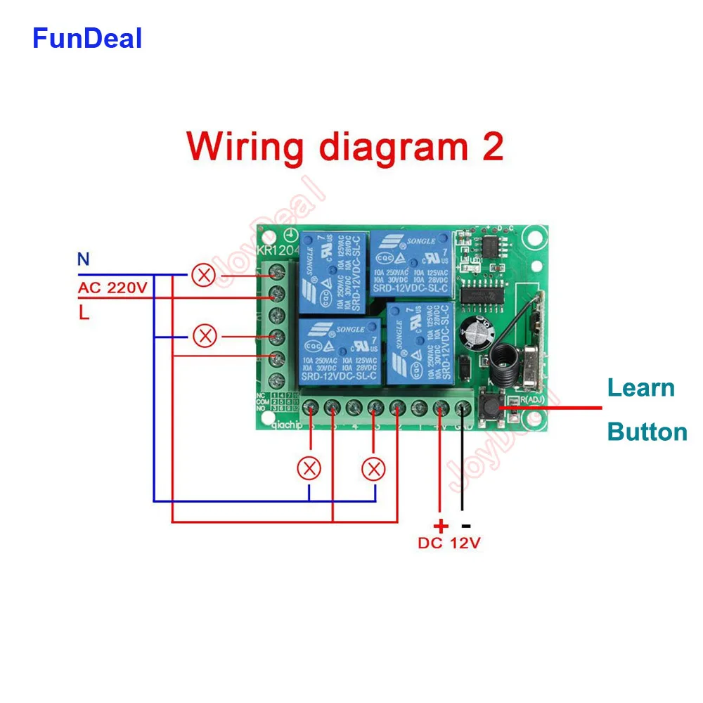 Нажмите одну кнопку в течение одного времени, соответствующий канал работает/включен;Нажмите ту же кнопку снова и выключите.(4-канальный переключатель (приемник) Требуется 4 кнопки дистанционного управления (передатчик).