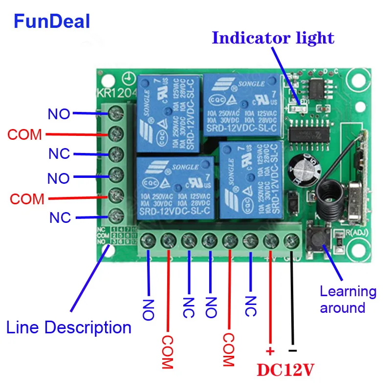 + V-положительный полюсный входGND-вход отрицательного полюса1 -KC1 нормальное закрытие реле (NC)2 -KC1 общее реле (COM)3 -KC1 нормальное открытие реле (нет)4 -KC3 нормально замкнутый реле (NC)5 -KC3 общее реле (COM)6 -KC3 нормально открытый реле (нет)7 -KC2 нормальное закрытие реле (NC)8 -KC2 Общие Реле (COM)9 -KC2 нормальное открытие реле (нет)10 -KC4 нормальное закрытие реле (NC)11 -KC4 Общие Реле (COM)12 -KC4 нормальное открытие реле (нет)