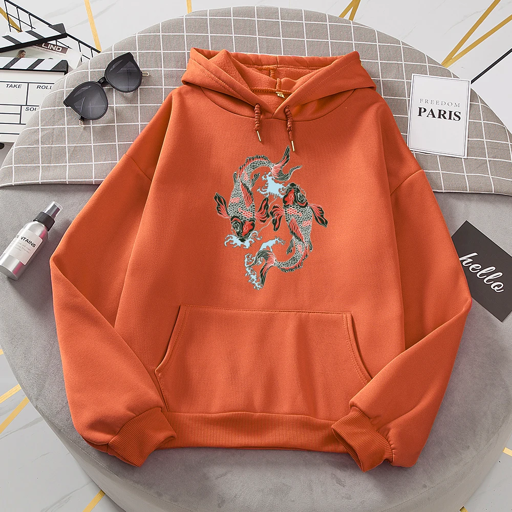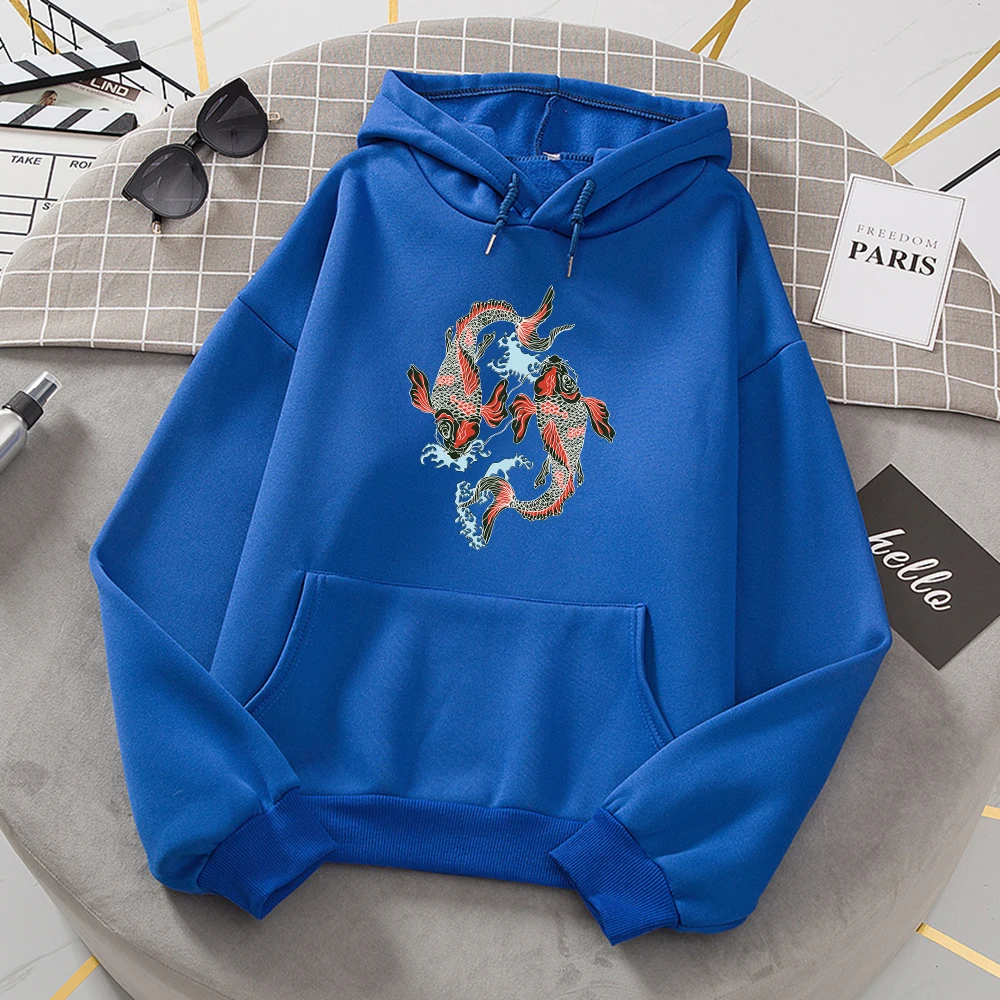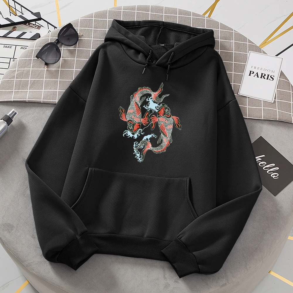 Худи в японском стиле с двумя тотемными принтами кои, Женская Осенняя уличная толстовка, свободная модная толстовка, мультяшная повседневная одежда для мужчин