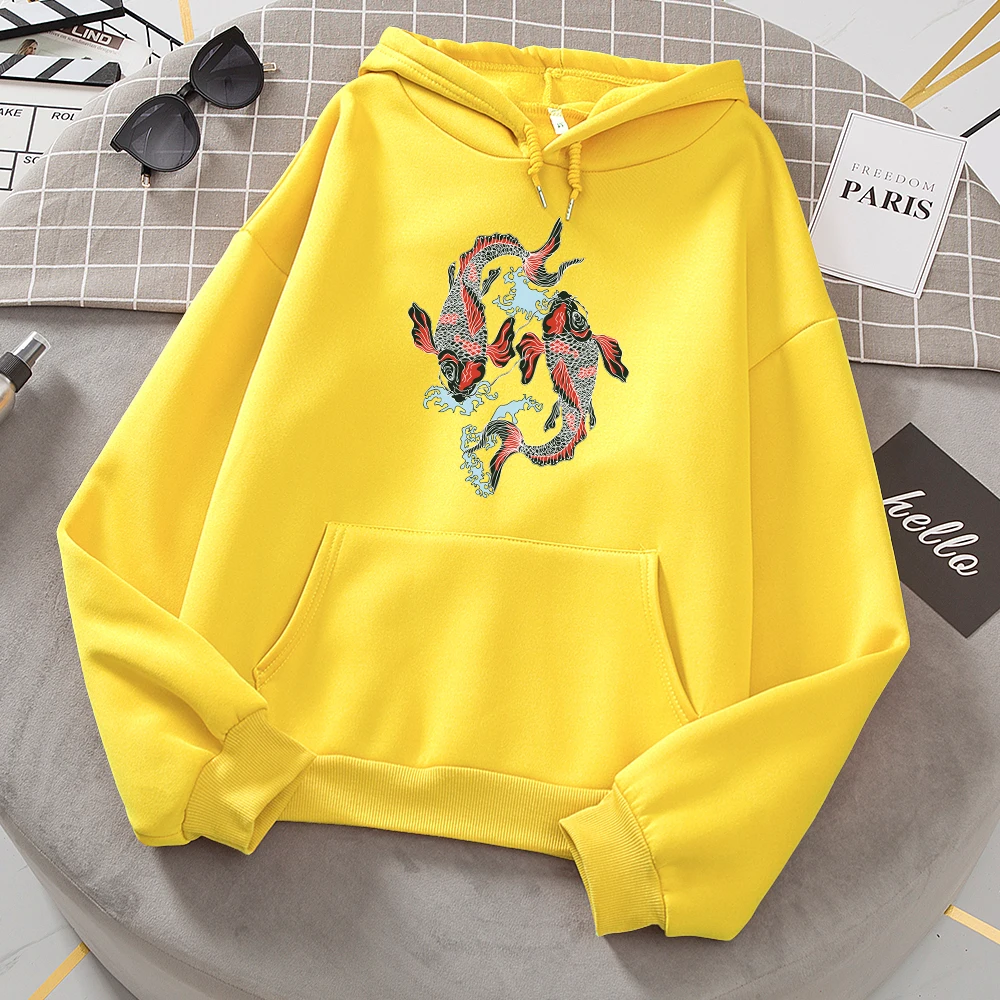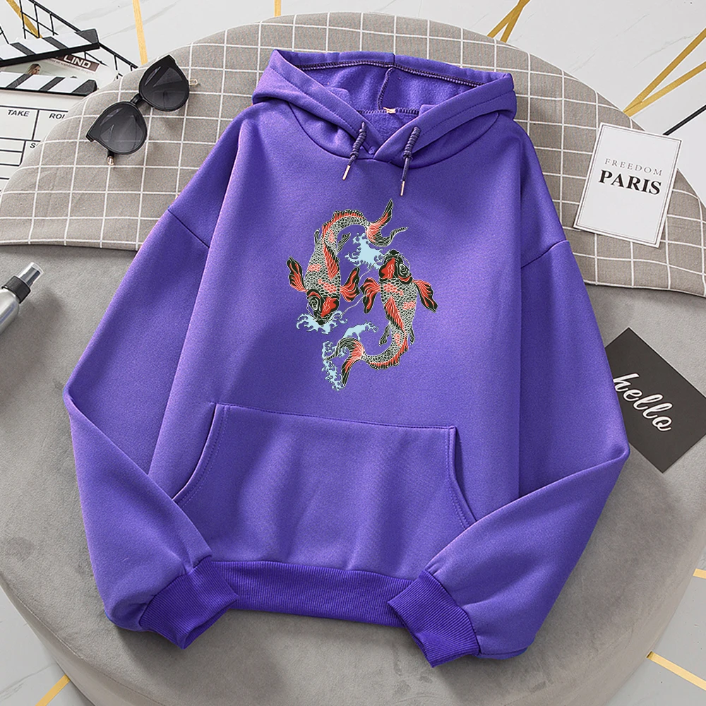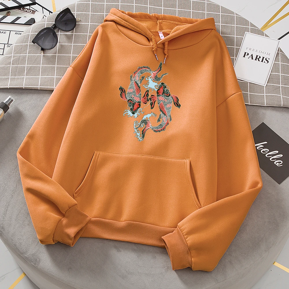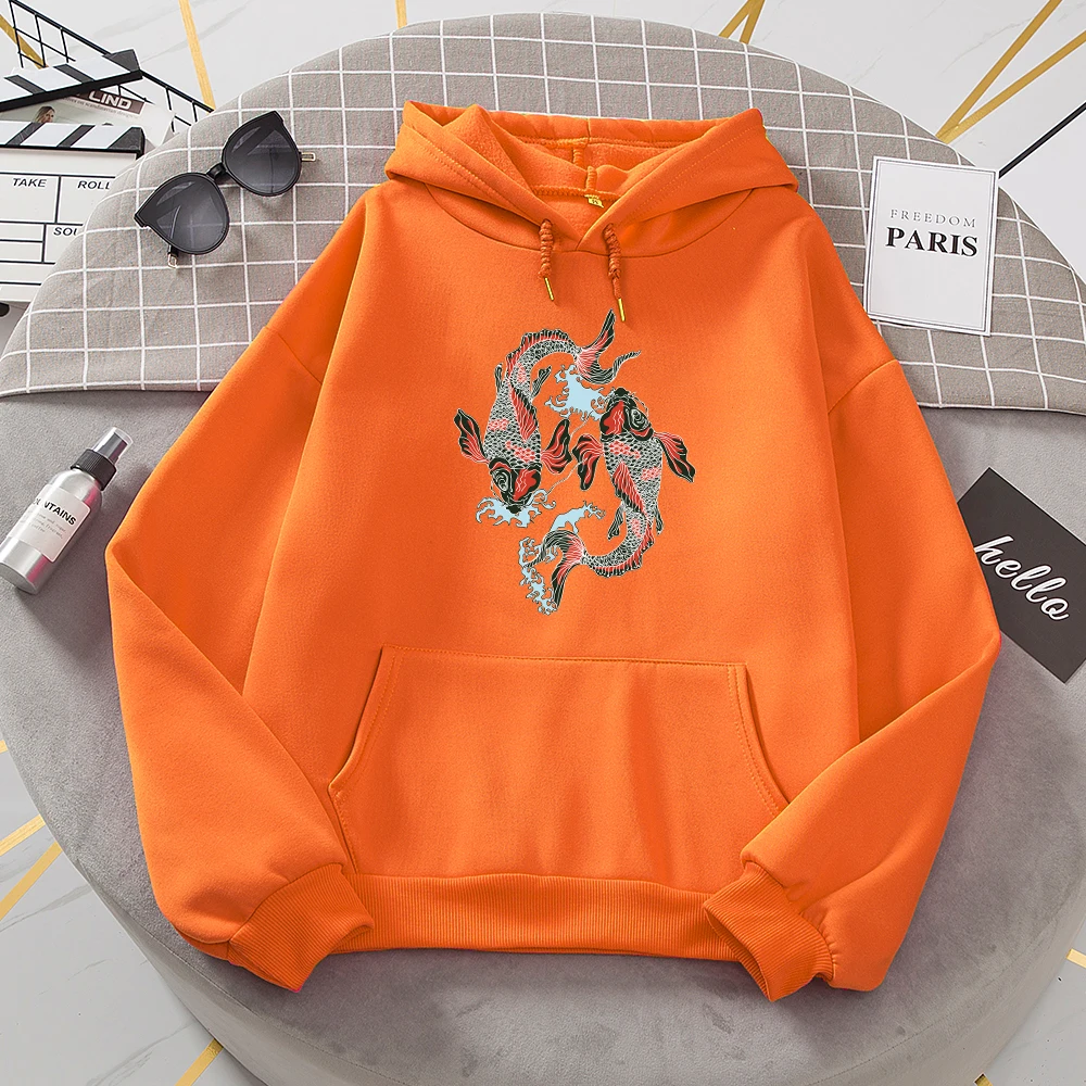 Худи в японском стиле с двумя тотемными принтами кои, Женская Осенняя уличная толстовка, свободная модная толстовка, мультяшная повседневная одежда для мужчин