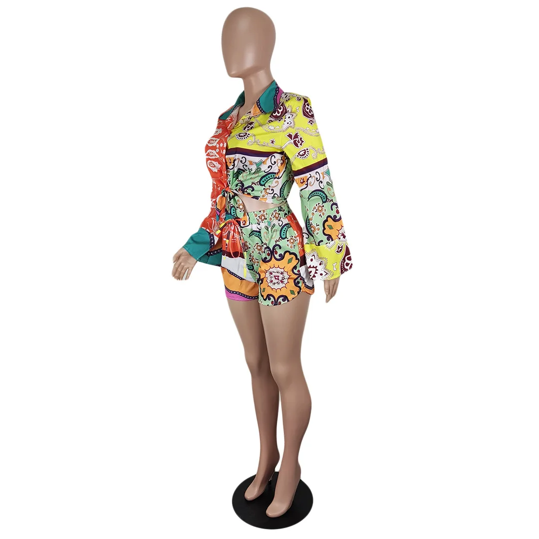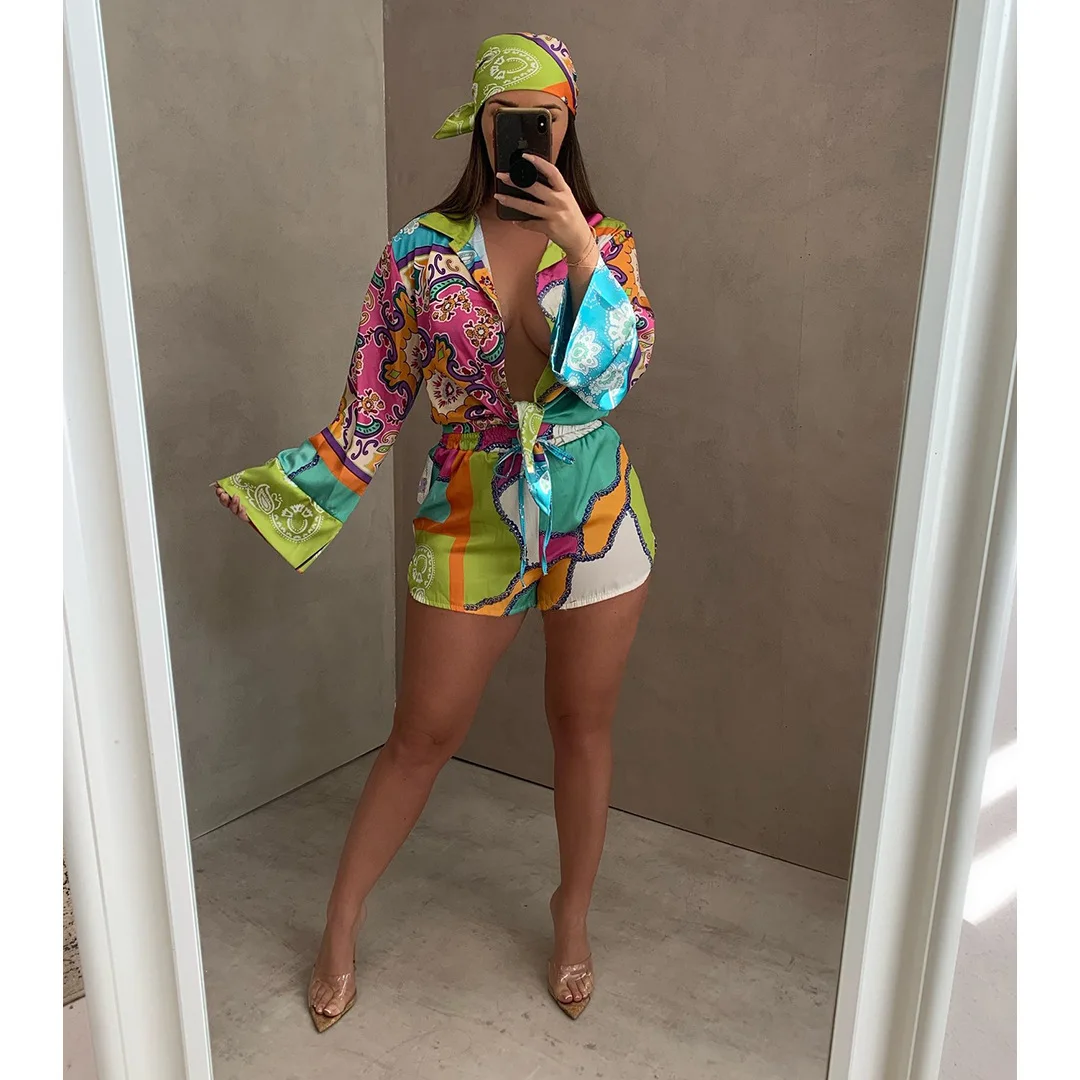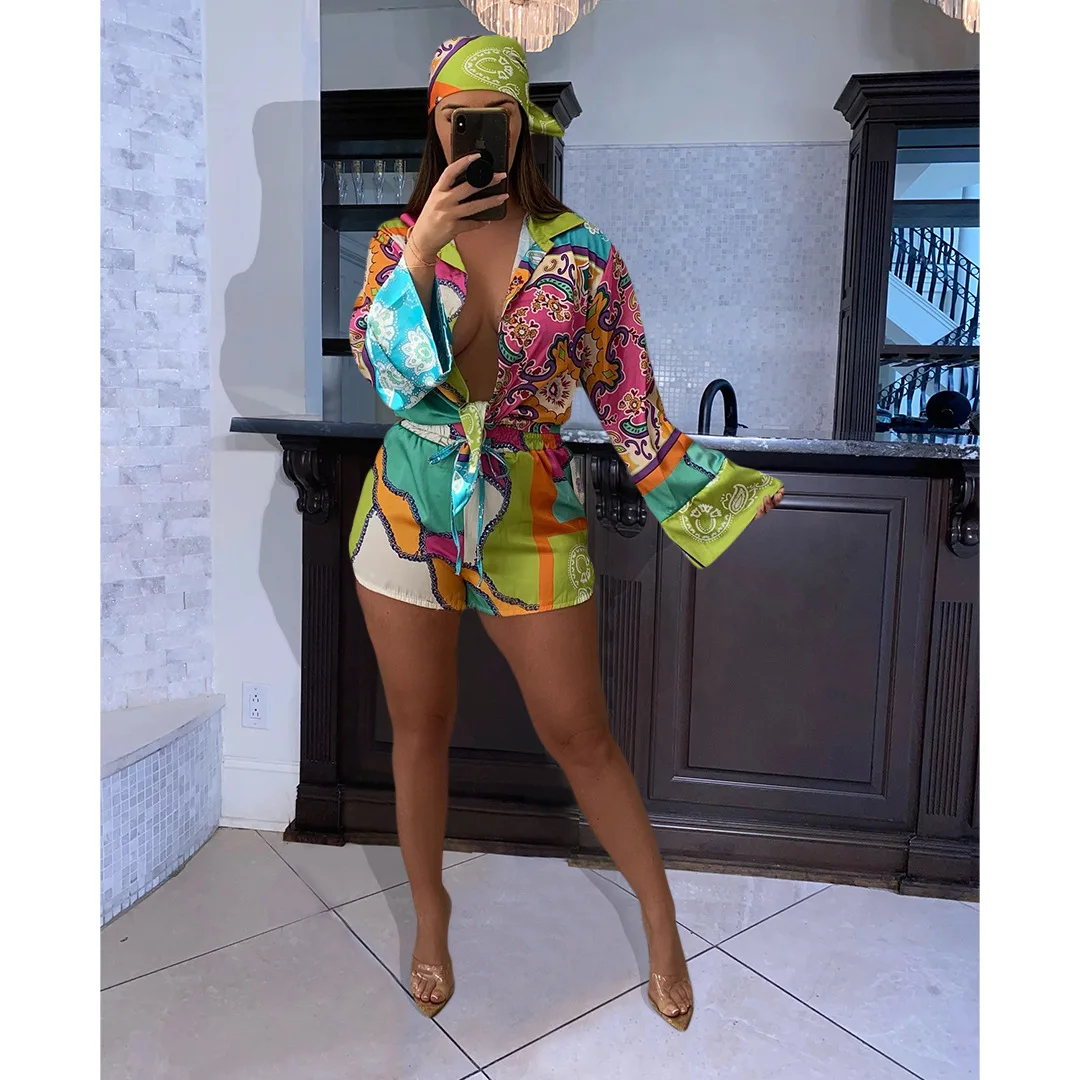 Женский комплект из 2 предметов, блузка с отложным воротником и шорты с принтом, летний пляжный костюм, 2021