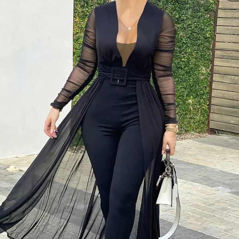 Комбинезоны женские однотонные с V-образным вырезом и поясом, облегающий прозрачный боди с длинным рукавом, костюм для свадебной вечеринки, лето