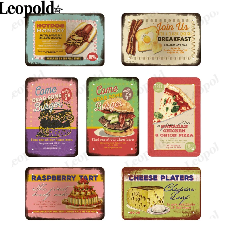 Винтажный металлический постер с едой, кофе, хот-дог, сыр, жестяная тарелка, доска для бургеров, букв, украшение для дома, ресторана, бара, клуба, настенное украшение 20x30 см