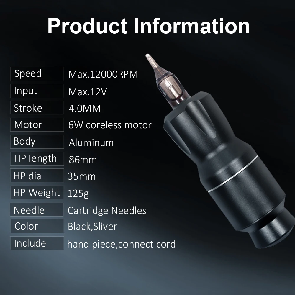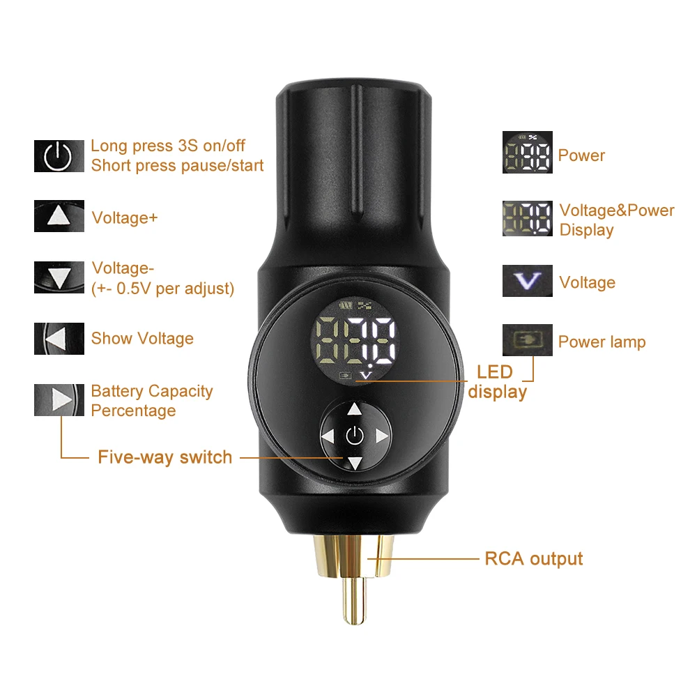 Товар: перезаряжаемый беспроводной источник питания для татуСтандарт: RCA ConnectВремя зарядки: 5 часовВремя работы: 4-6 часовВходное напряжение: DC5VМетод использования: НажмитеЗарядный разъем рекомендуется: 5V-1A (не входит в комплект), не используйте зарядное устройство более 5 В (поврежденная машина на свой собственный риск.)Аккумулятор: 1500 мАч литиевая батареяРазмер: 7.9x3x3.3cmВес: 70 гИнструкции(1) Полная зарядка для первого использования(2) Нажмите пятисторонний переключатель посередине: Нажмите и удерживайте кнопку ВКЛ./ВЫКЛ., нажмите кнопку «пауза»/«СТАРТ»(3) в верхней и нижней части пятипозиционный переключатель представляют собой напряжение плюс и минус (0,5 V для регулировки напряжения)(4) нажмите вправо, чтобы отобразить процент мощности, и нажмите влево, чтобы вернуть интерфейс напряжения(5) Если мощность менее 19%, индикатор зарядки будет мигать: Подключите зарядное устройство и лампу остаться на(6)100% полная мощность, полный светодиодный светильникПримечание: Не используйте зарядное устройство более 5 В (повреждает машину на свой собственный риск.)Изделие: тату-машинкаМатериал: алюминиевый сплавДлина Кол-во игл: 3,5 ммВес: около 135 гЦвета: черный, серыйСкорость: max.12000RPMВход: Макс. 12 ВДвигатель: 6 Вт без сердечникаРазмер: 86 мм * 35 ммИгла: иглы картриджаПримечание:1. Наша машина поддерживает индивидуальный логотип.2. Допускается погрешность 3% при ручном измерении. Спасибо за пониманиеОсобенности1. Может регулировать интенсивность и частоту питания, частоты, резки, запотевания, цвета, портрета и так далее в соответствии с требованиями.2. Легко и быстро окрашивается, повреждения кожи меньше, легко обрабатывается, меньше шума, меньше вибрации, чем традиционная катушка тату-машины.3,6 W Мощный мотор обеспечивает сильную и стабильную работу.4. Тонкое мастерство, не жарко после долгой работы.5. Использование новейшего 10-слотного эксцентрикового колеса для обеспечения длительного срока службы.