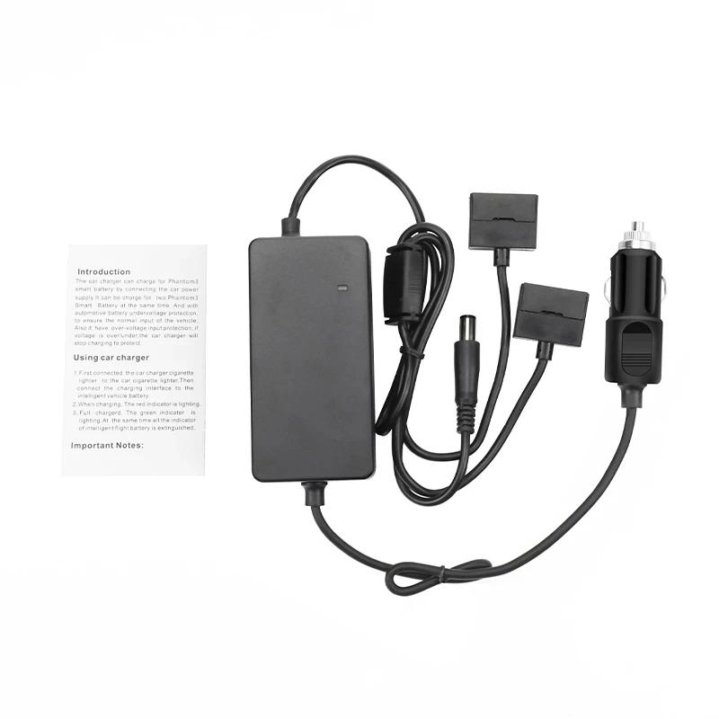 Характеристики:Вход: 12-14 В/10 А (макс.)Выход: 17,6 в/3,0а * 2 (3A при зарядке 1 батареи, 3,8а * 2 при зарядке 2 батареи)Полная защита: Перенапряжение, Перегрузка по току, перезарядка, перегрев, перезагрузка, защита от короткого замыканияВремя зарядки: одна батарея около 75 минут, 2 батареи около 95 минутДлина кабеля: 36 дюймовСовместим с: DJI phantom 3 Professional, DJI Phantom 3 Advanced, DJI phantom 3 Standard, DJI phantom 3 SE, DJI phantom 3 4K.Упаковка включает в себя:1 * Автомобильное зарядное устройство серии DJI Phantom 3 (батарея и передатчик в комплект не входят)1 * Руководство пользователя